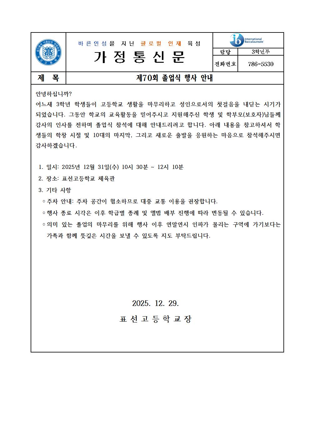 제70회 졸업식 행사 안내 가정통신문