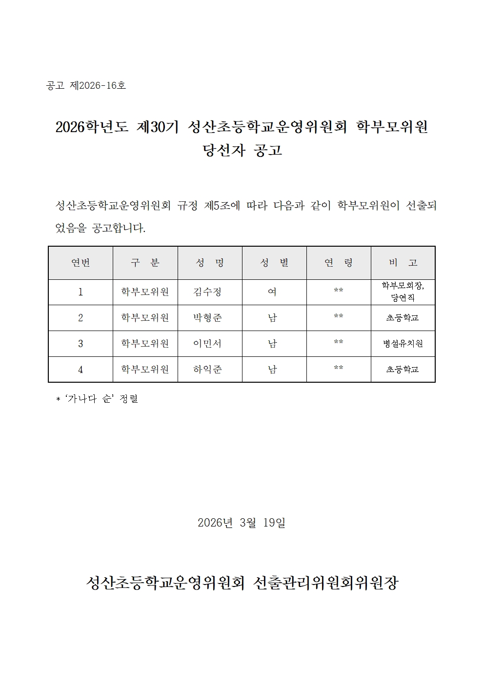 [공고]2026학년도 제30기 학교운영위원회 학부모위원 당선자 확정 공고