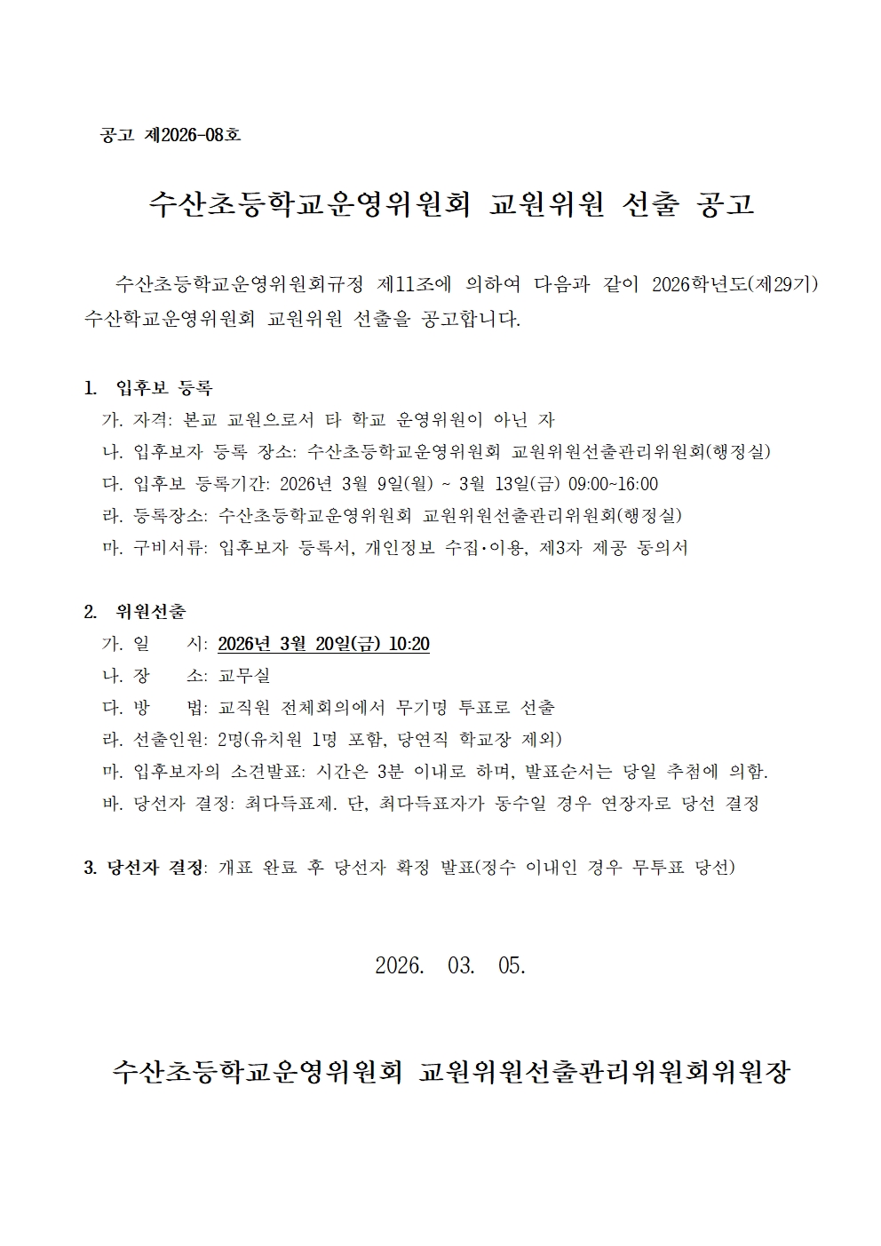 2026학년도(제29기) 수산초등학교운영위원회 교원위원 선출 공고