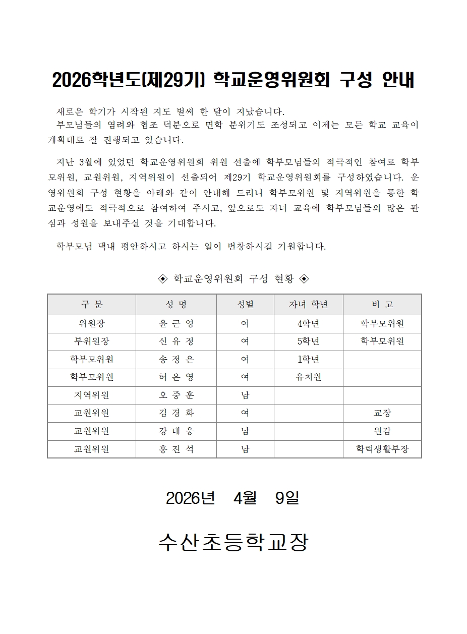 2026학년도(제29기) 수산초등학교운영위원회 구성 안내