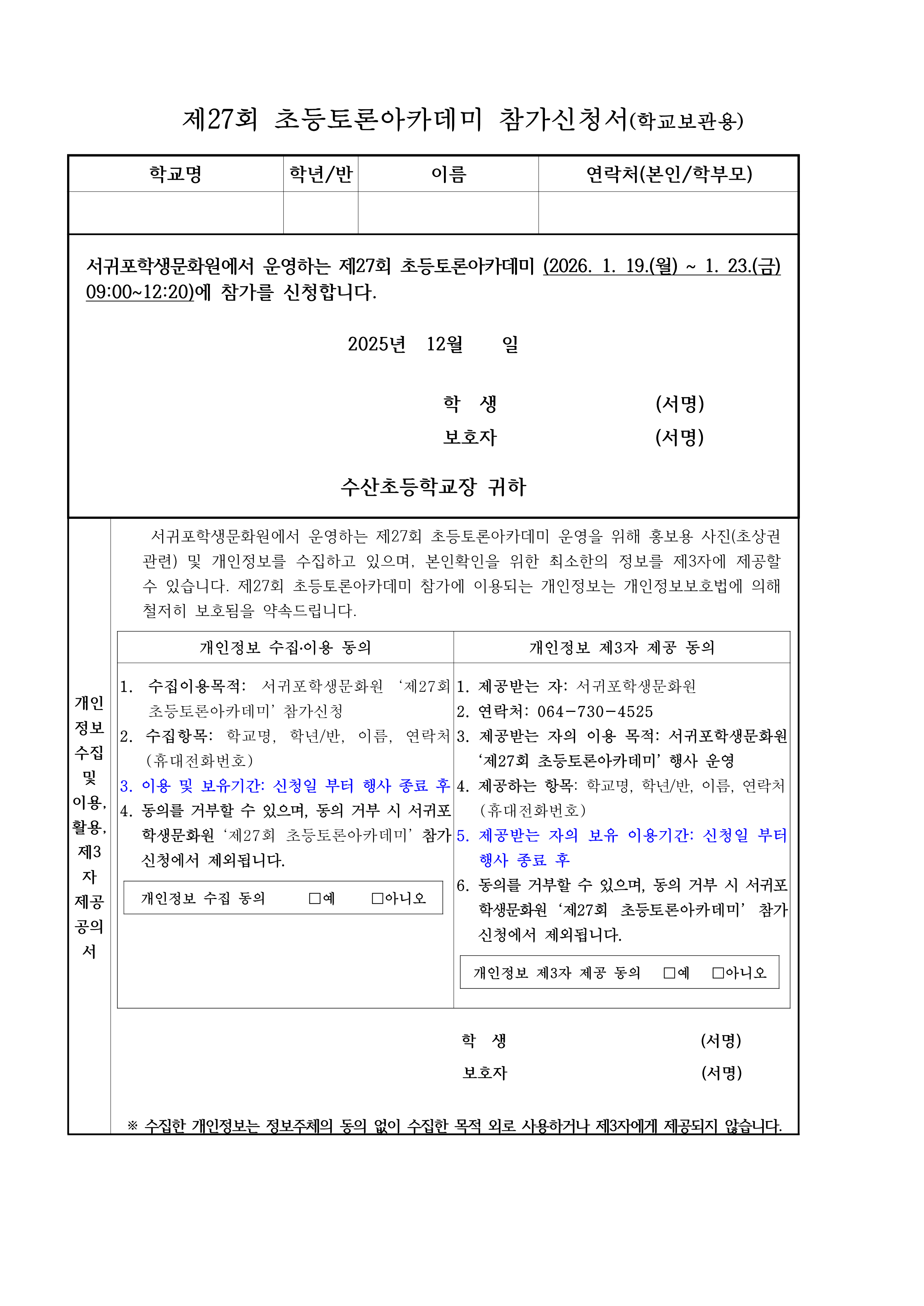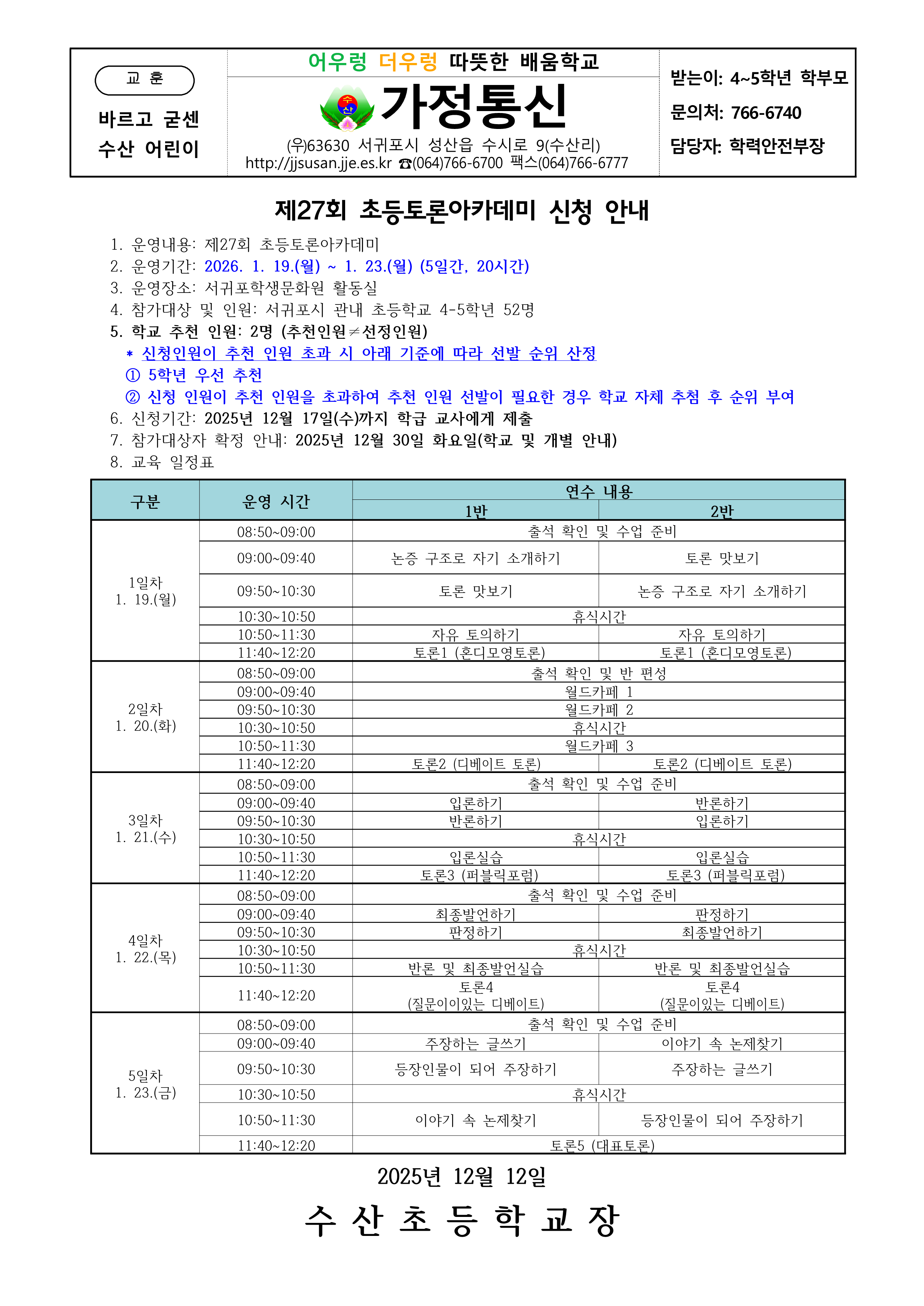 [가정통신문]제27회 초등토론아카데미 신청 안내