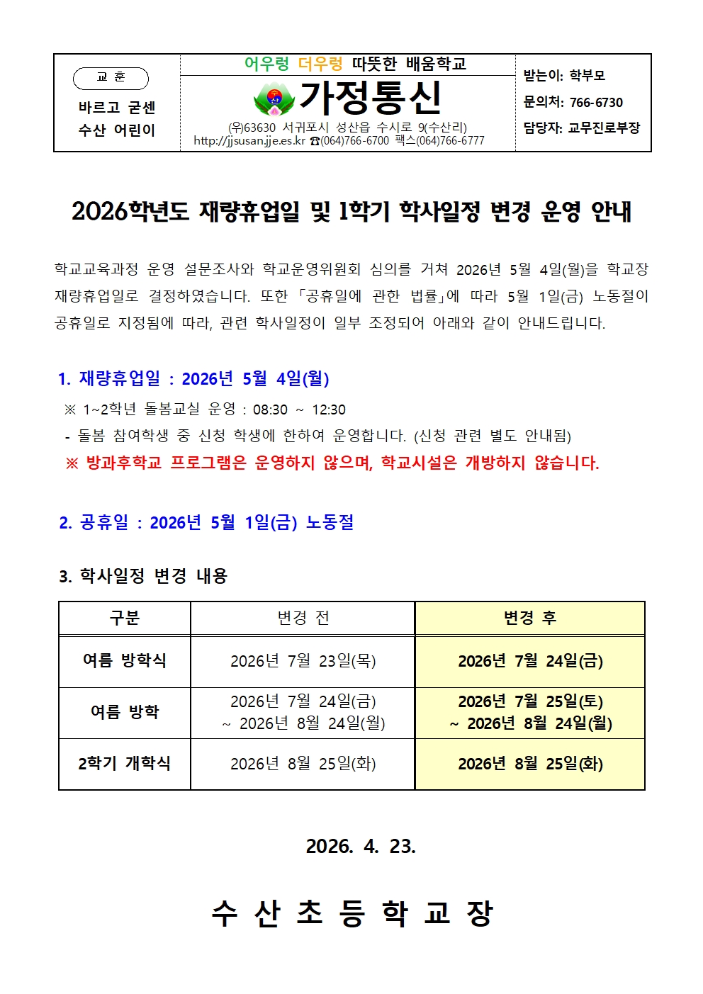 2026학년도 재량휴업일 안내 가정통신문