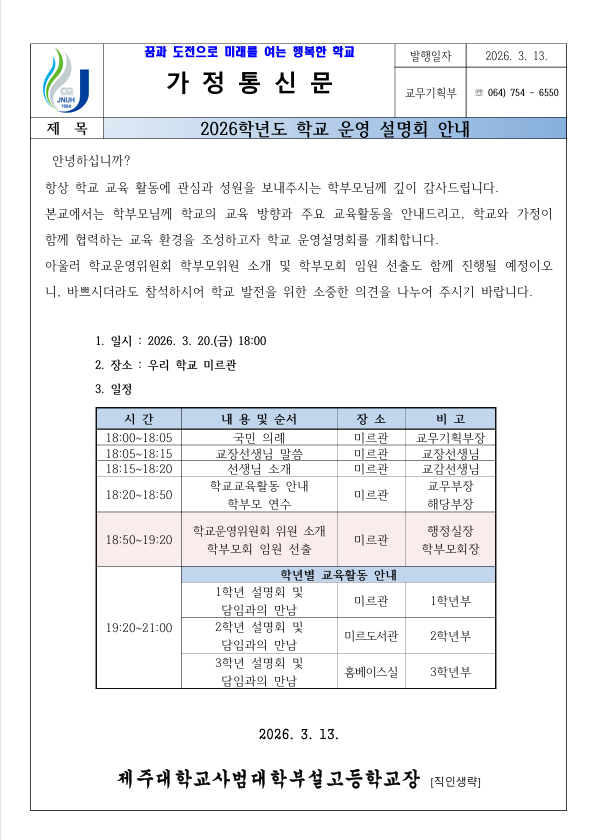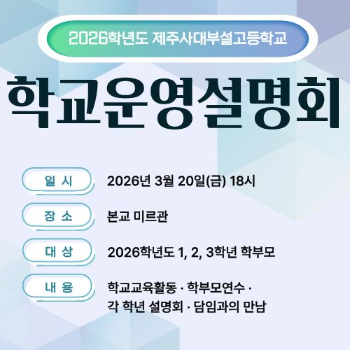본교에서는 학부모님께 학교의 교육 방향과 주요 교육활동을 안내드리고, 학교와 가정이 함께 협력하는 교육 환경을 조성하고자 학교 운영설명회를 개최합니다.