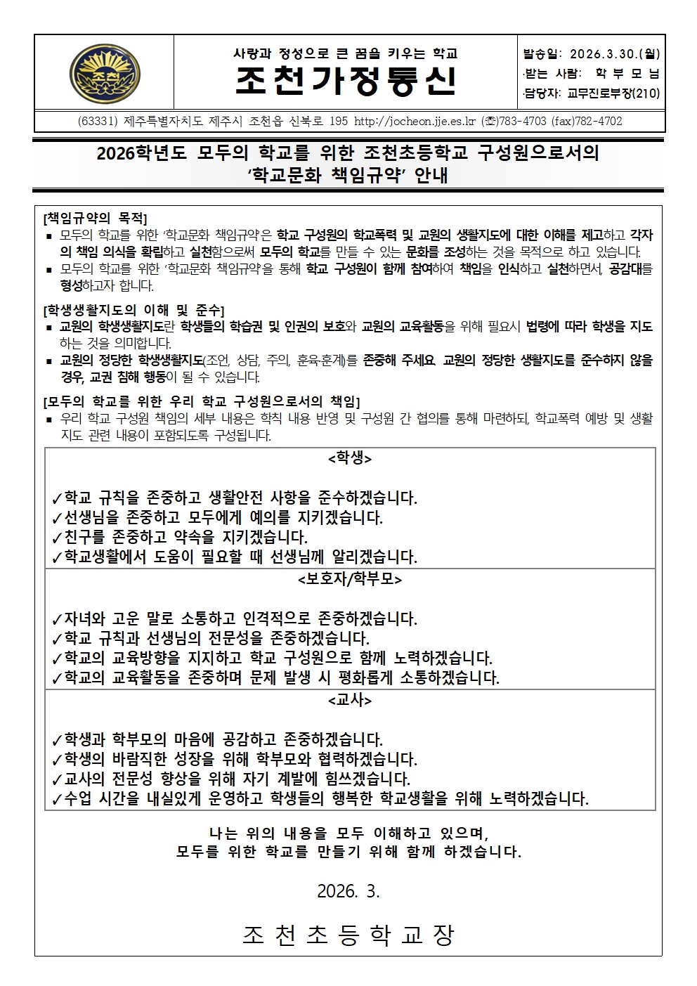 2026학년도 조천초등학교 구성원으로서의 학교문화 책임규약 안내