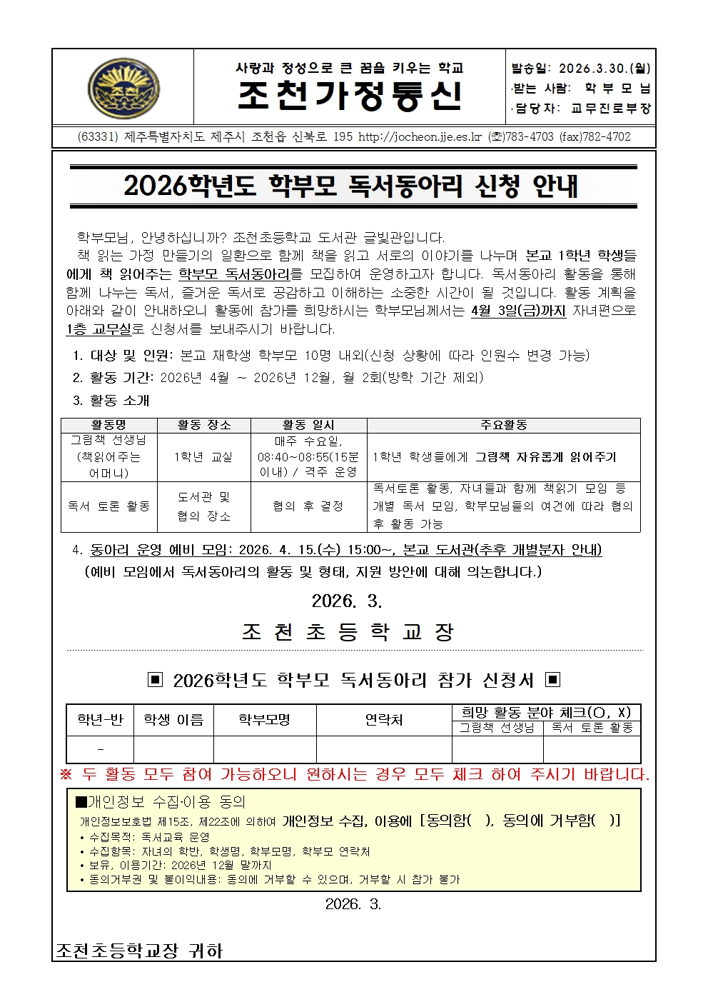 2026학년도 학부모 독서동아리 신청 안내