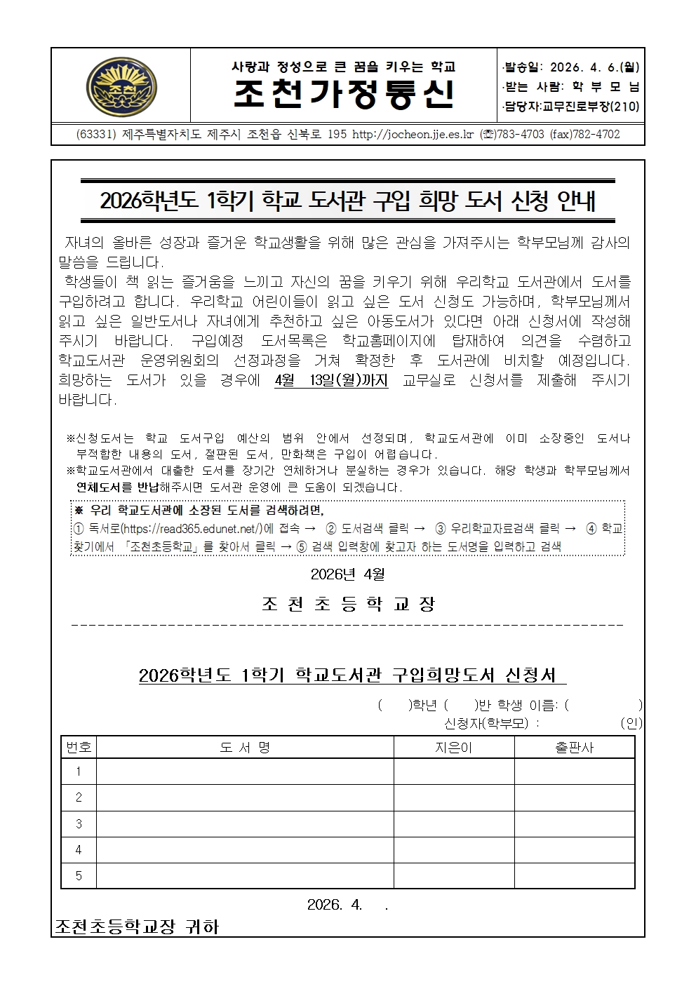 2026학년도 1학기 학교 도서관 구입 희망 도서 신청 안내