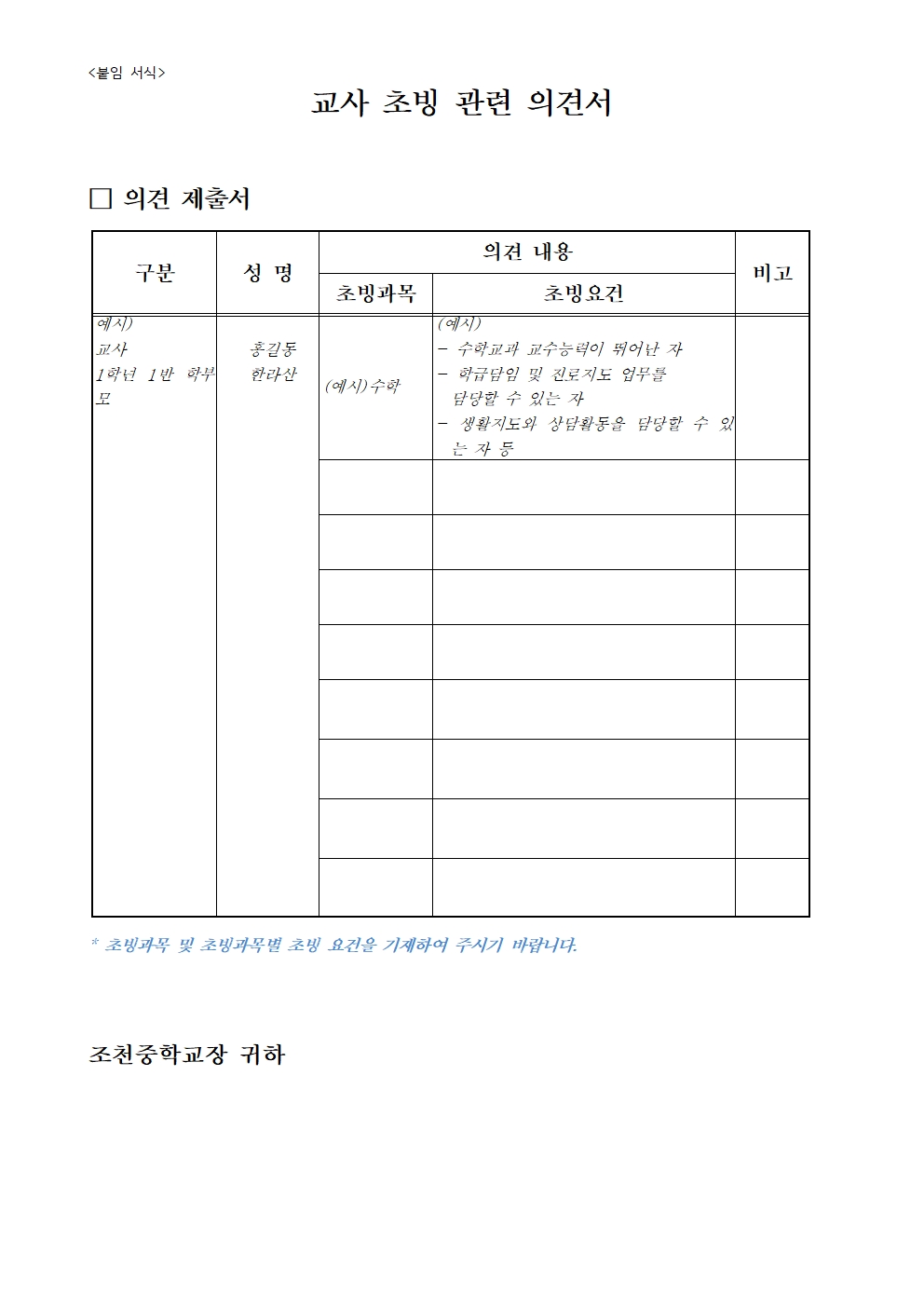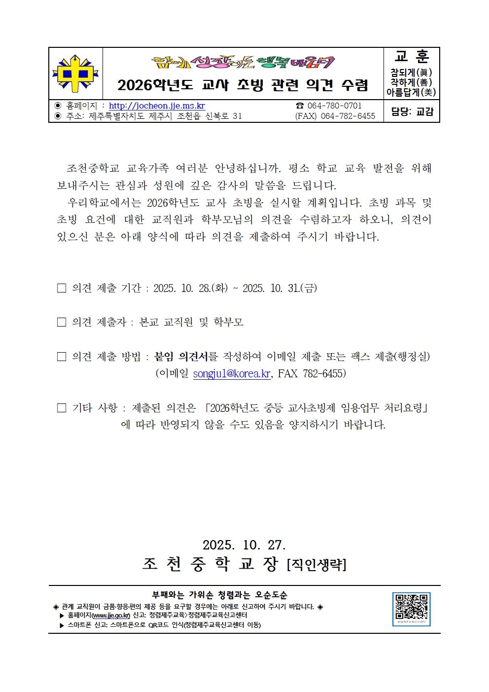 2026학년도 교사 초빙 관련 의견 수렴
