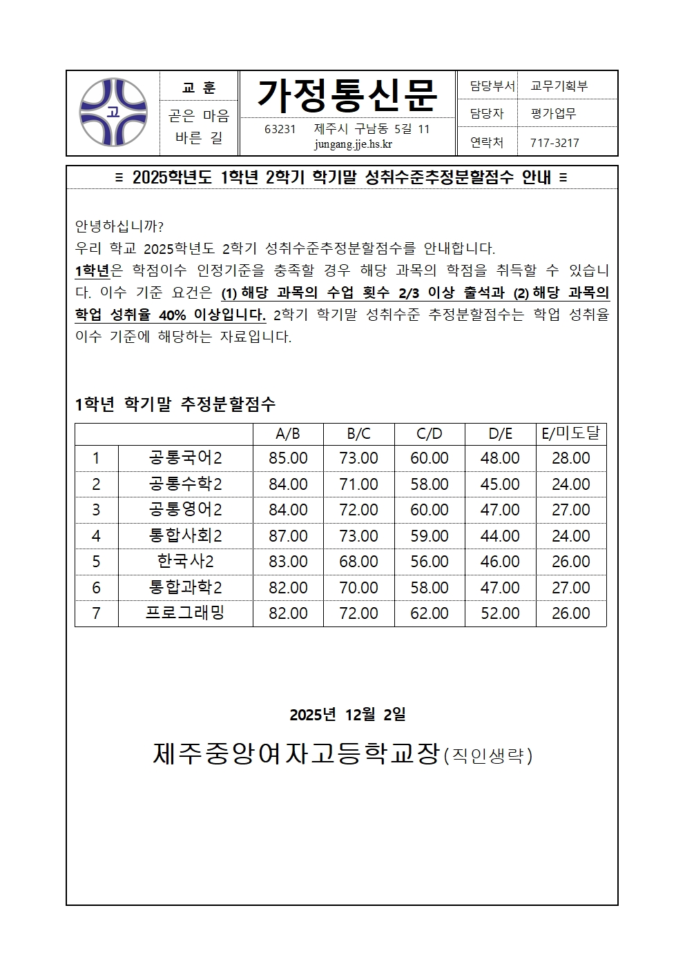 2025학년도 2학기 학기말 성취수준추정분할점수 안내
