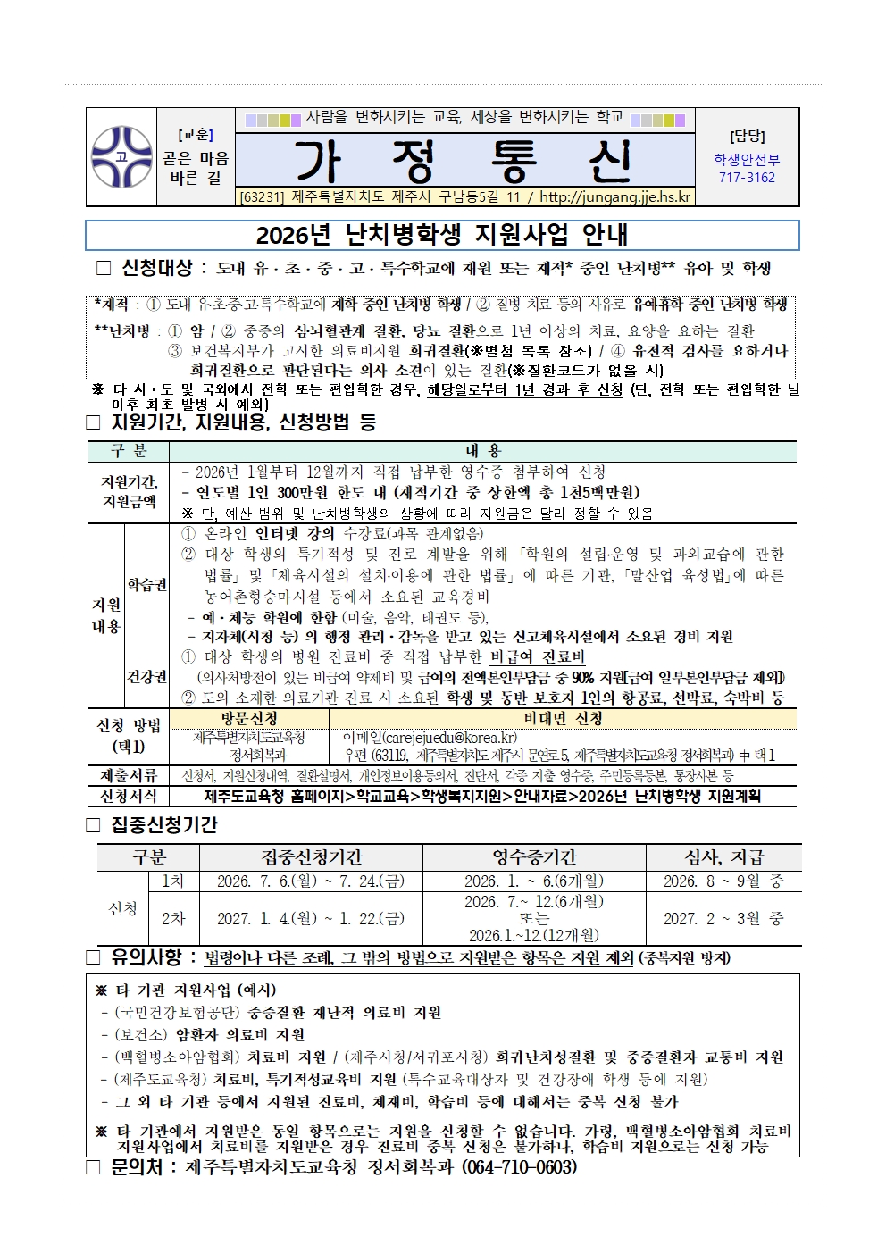 (제주특별자치도교육청 가정통신문) 2026년 고등학교로 찾아가는 진로·학업설계 1:1 맞춤형 컨설팅 운영 안내