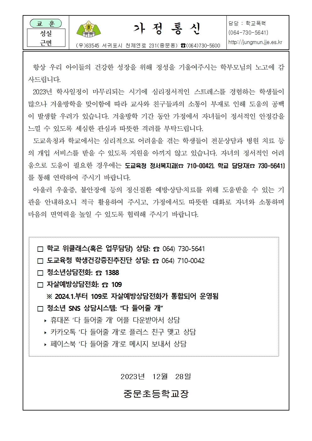 생명존중 및 자살예방 가정통신문