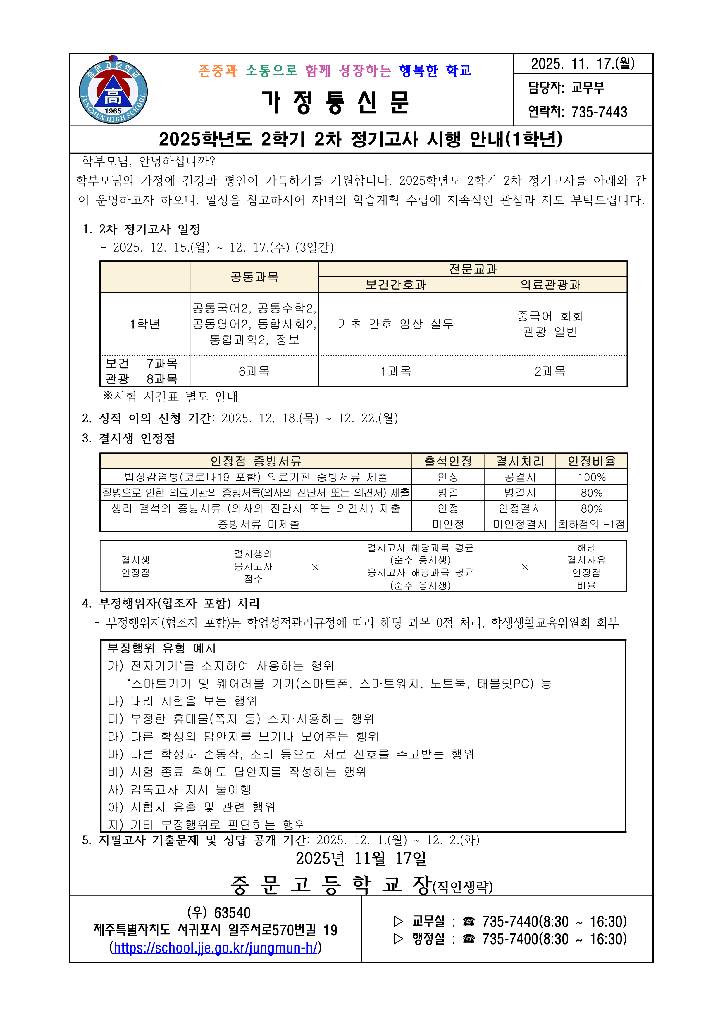 2025학년도 2학기 2차 정기고사 시행 안내 (1학년)