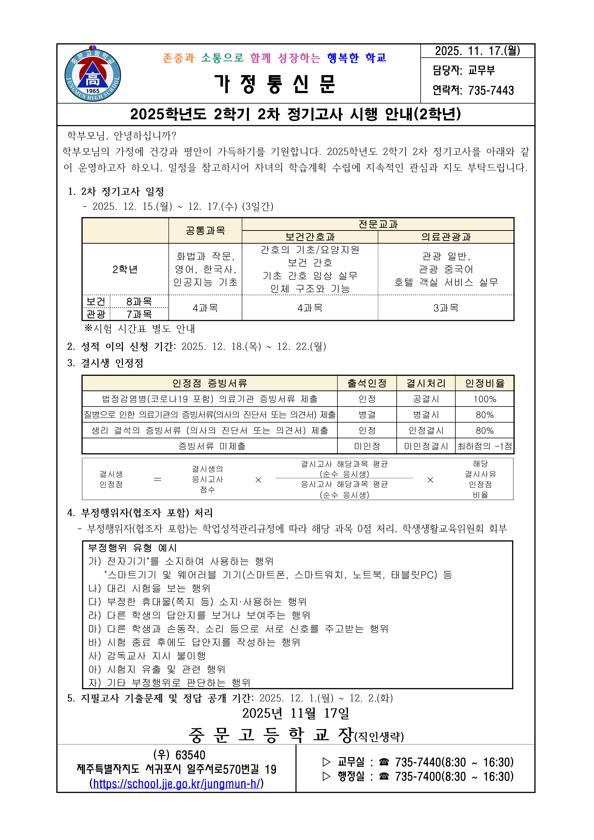 2025학년도 2학기 2차 정기고사 시행 안내 (2학년)