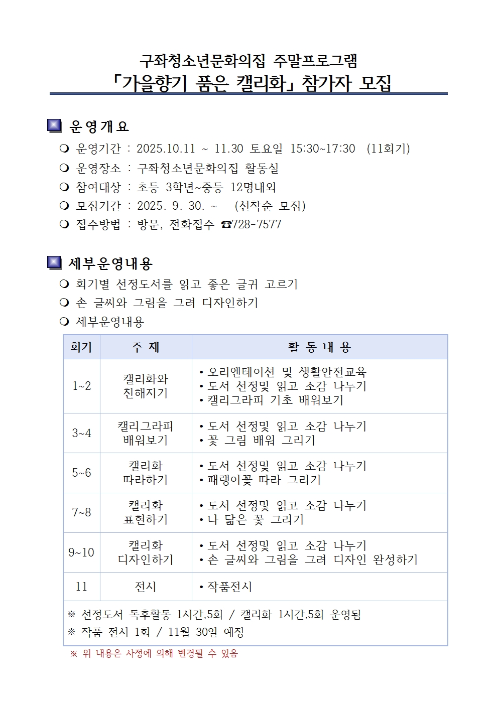 구좌청소년문화의집 "가을향기 품은 캘리화" 참가자 모집
