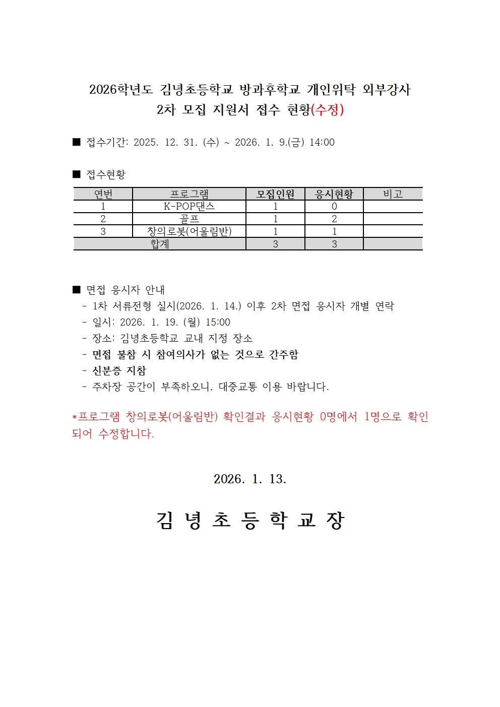 2026학년도 김녕초등학교 방과후학교 개인위탁 외부강사 모집 지원서 접수 현황(1월 14일 수정)