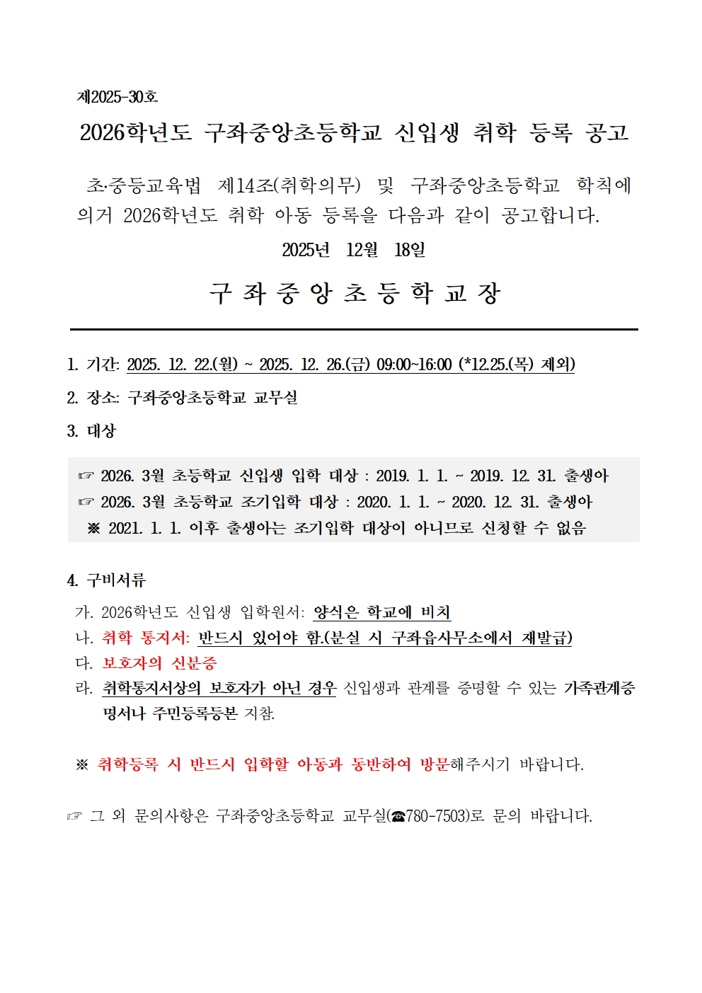 2026학년도 신입생 취학 등록 공고
