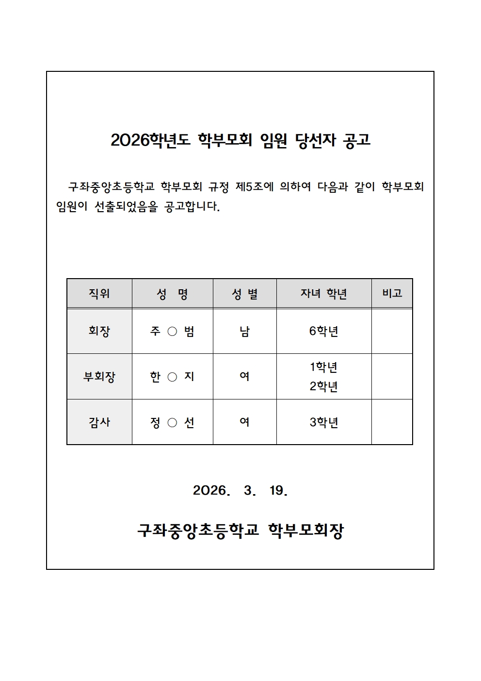 2026학년도 구좌중앙초등학교운영위원회 지역위원 당선자 공고