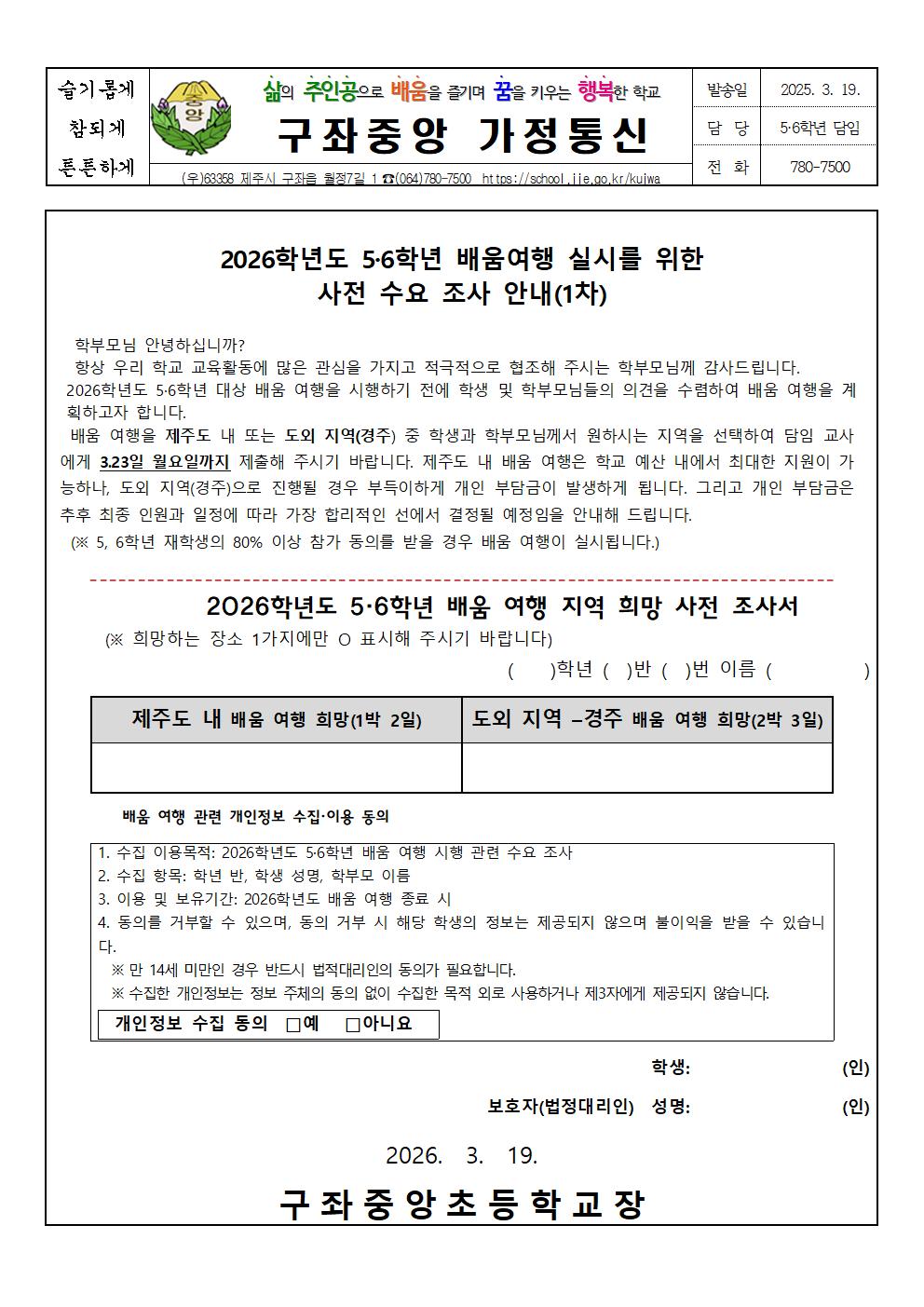 (가정통신문) 2026학년도 배움여행 사전https://school.jje.go.kr/images/com/fm/delete.png 수요 조사 안내(2차)