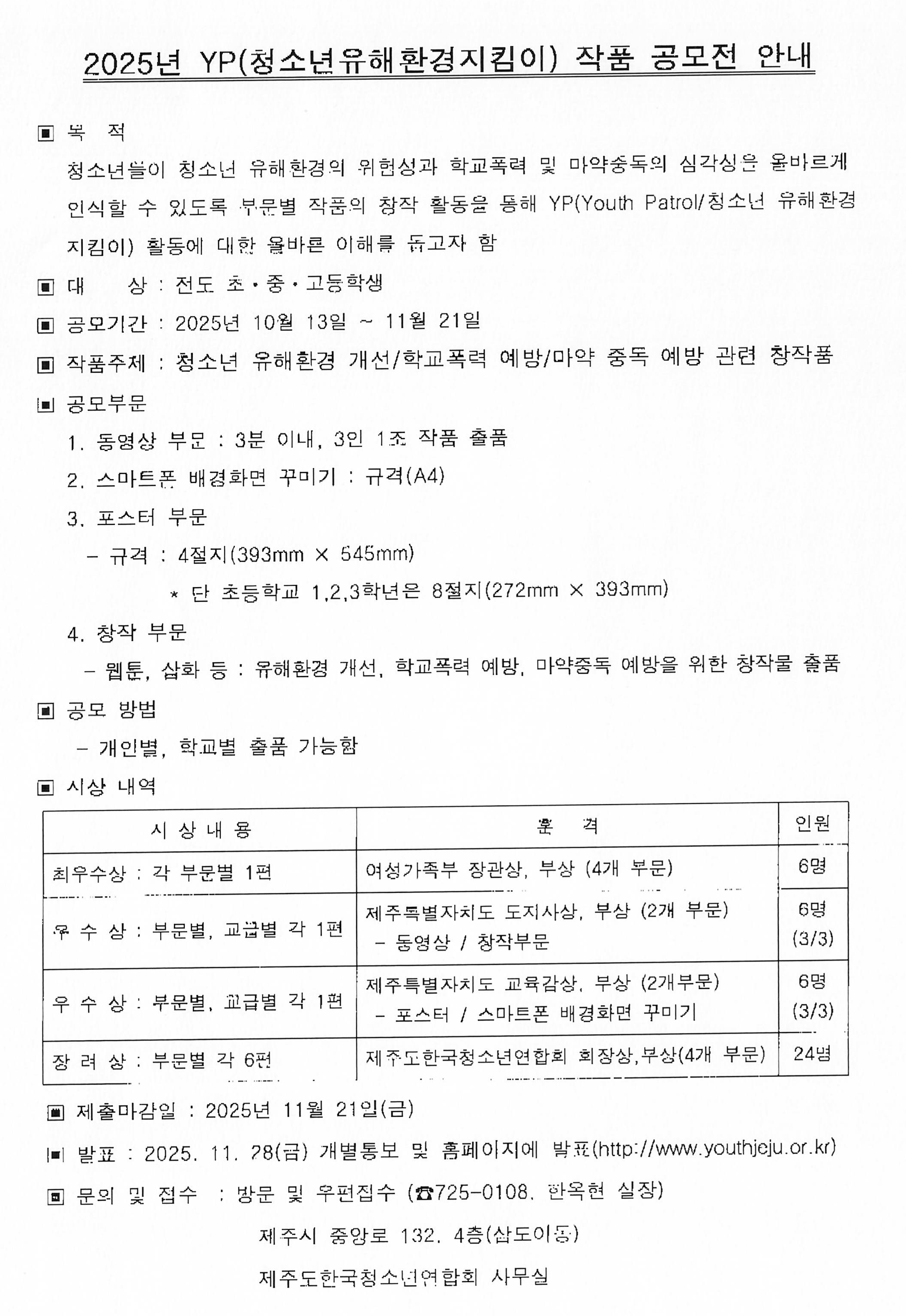 2025년 YP(청소년유해환경지킴이) 작품 공모전 안내