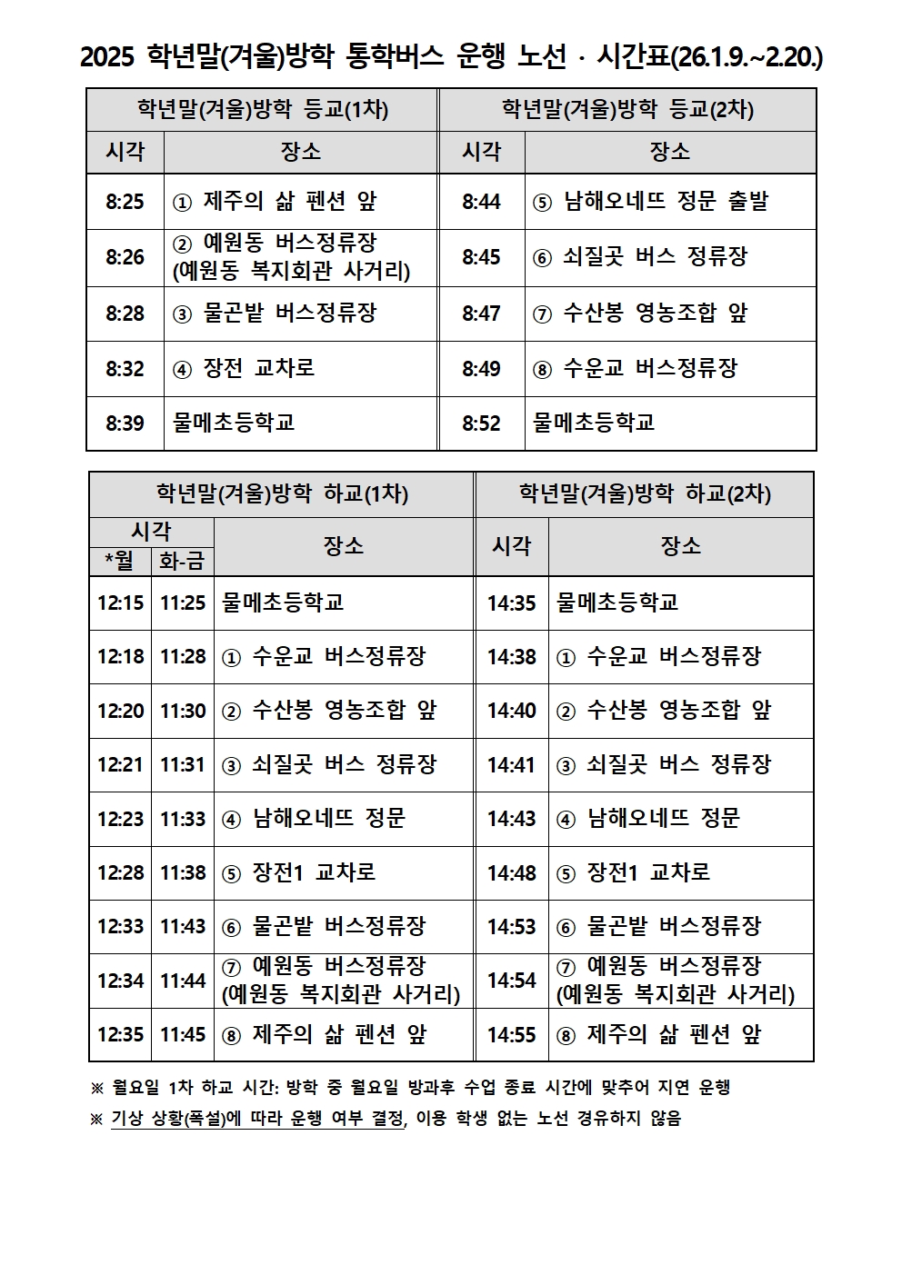 2025학년도 학년말(겨울)방학 통학버스 노선 및 시간표