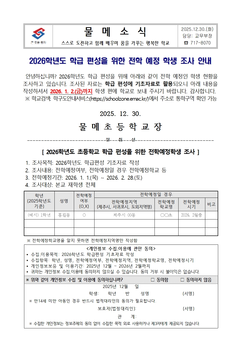 2026학년도 학급 편성을 위한 전학 예정 학생 조사 안내