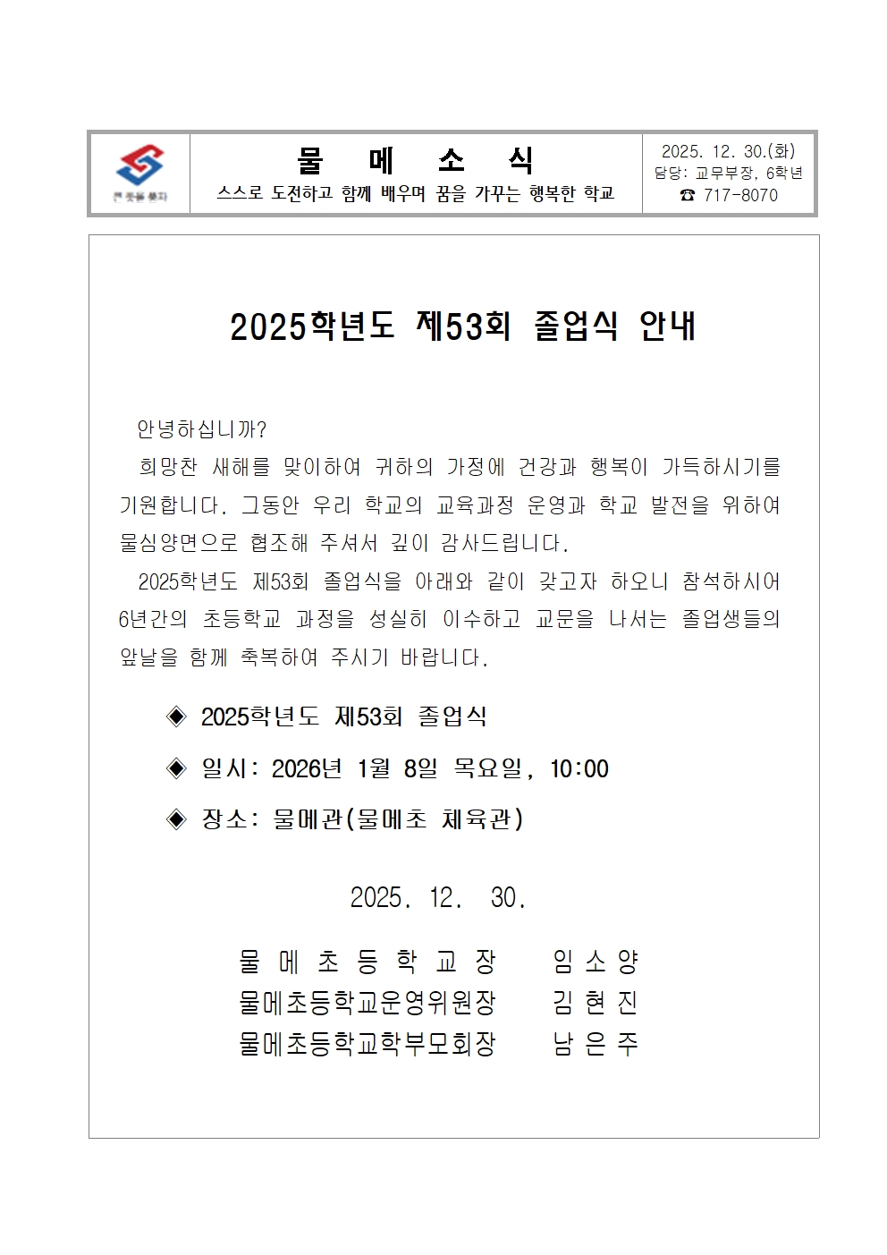 2025학년도 제53회 졸업식 안내