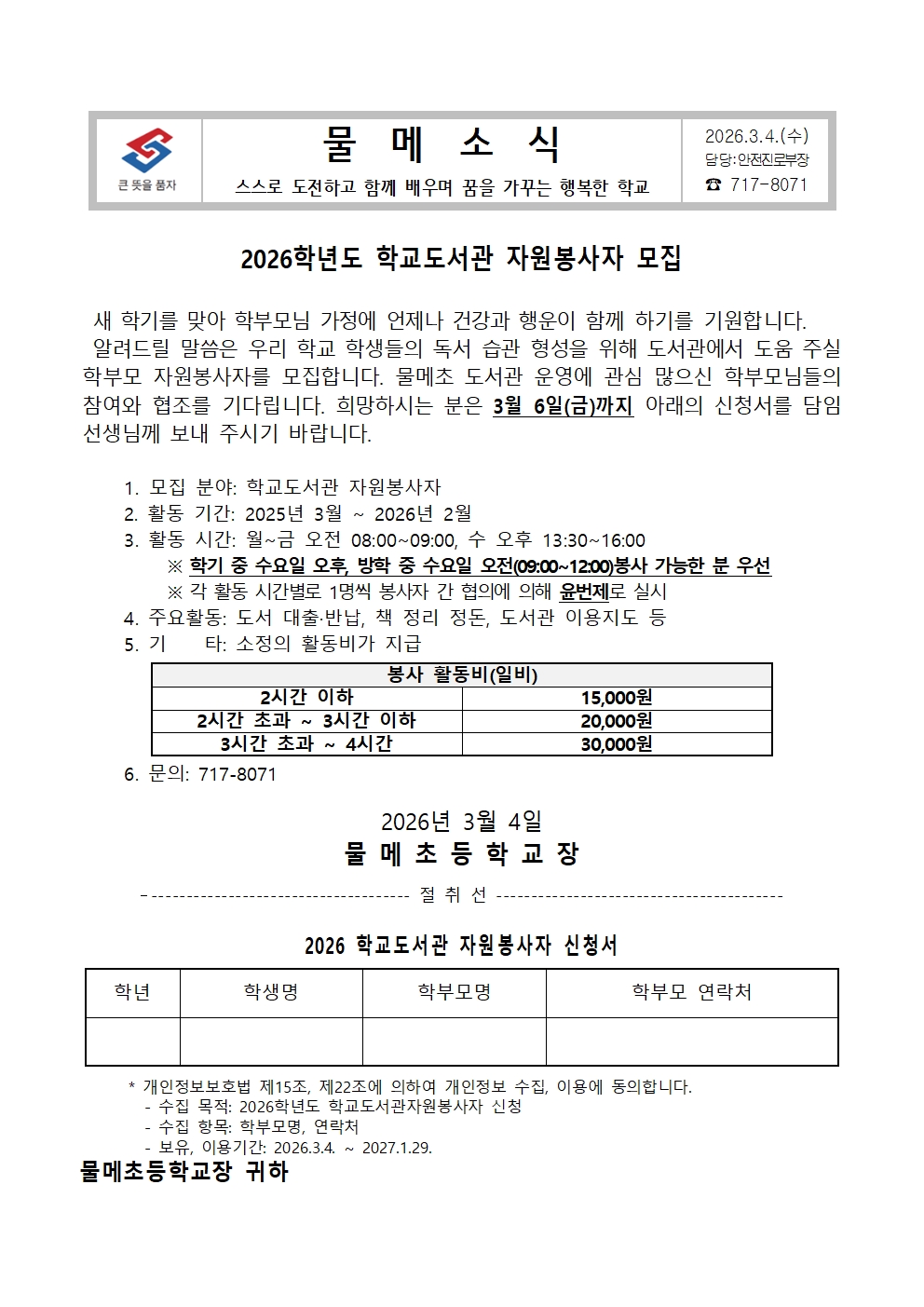 2026학년도 학교도서관 자원봉사자 모집