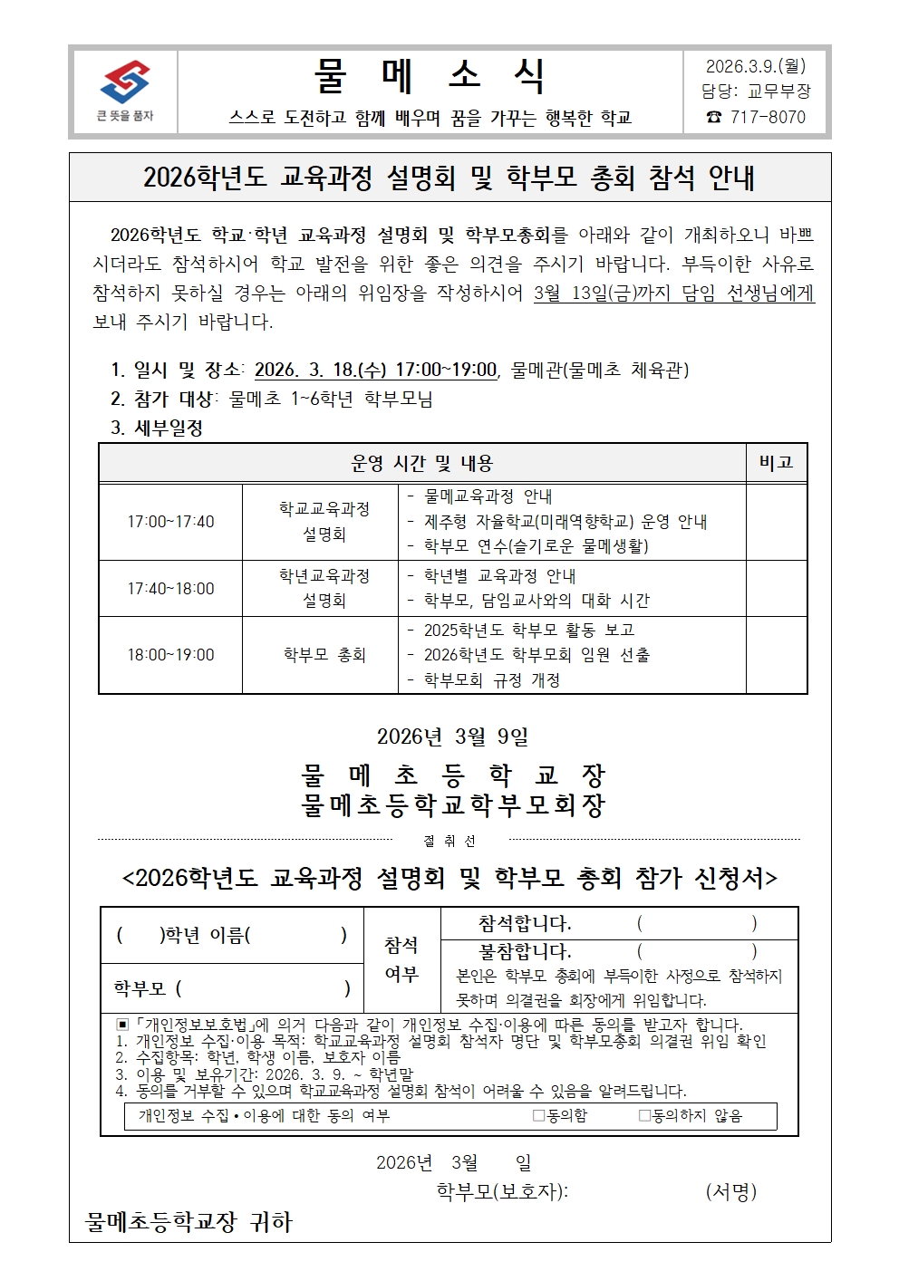2026 물메초 교육과정 설명회 및 학부모 총회 참석 안내