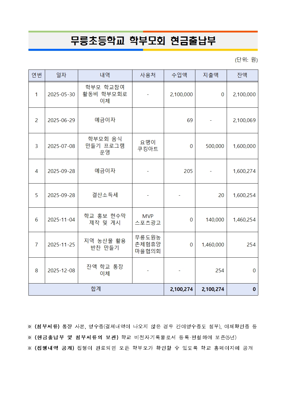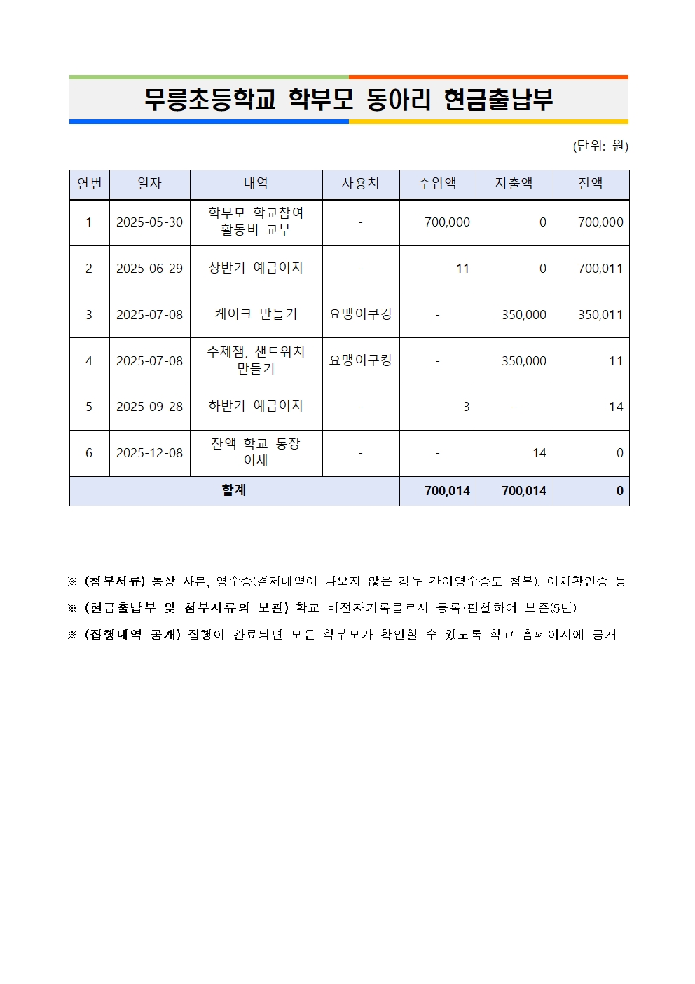 2025학년도 학부모 교육활동 지원 사업에 따른 학부모동아리 및 학부모 학교참여 활동비 현금 출납부 공개