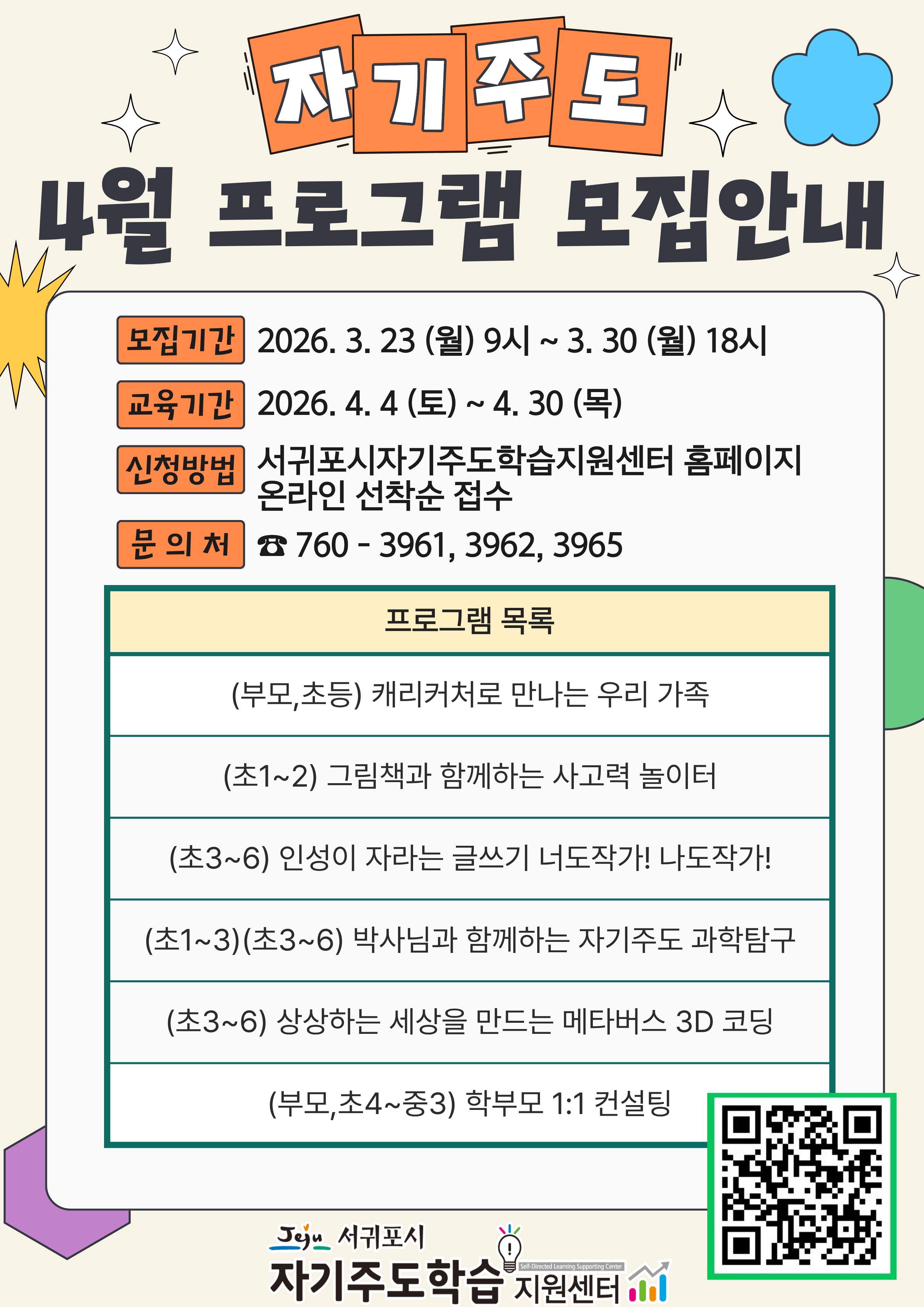 서귀포시 자기주도학습지원센터에서는 2026년 4월 프로그램 수강생을 아래와 같이 모집할 예정이오니 학부모님들께서는 많은 관심바랍니다.