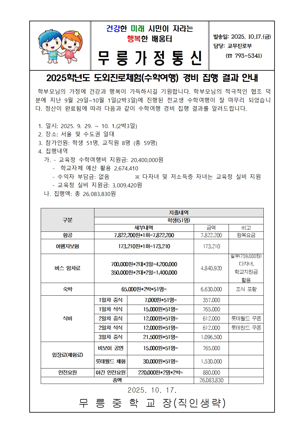 2025 도외진로체험학습(수학여행) 경비 집행 결과 안내