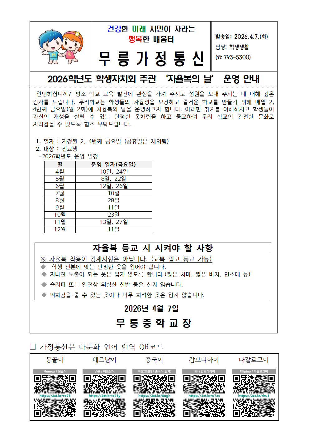 2026학년도 학생자치회 주관 ‘자율복의 날’ 운영 안내