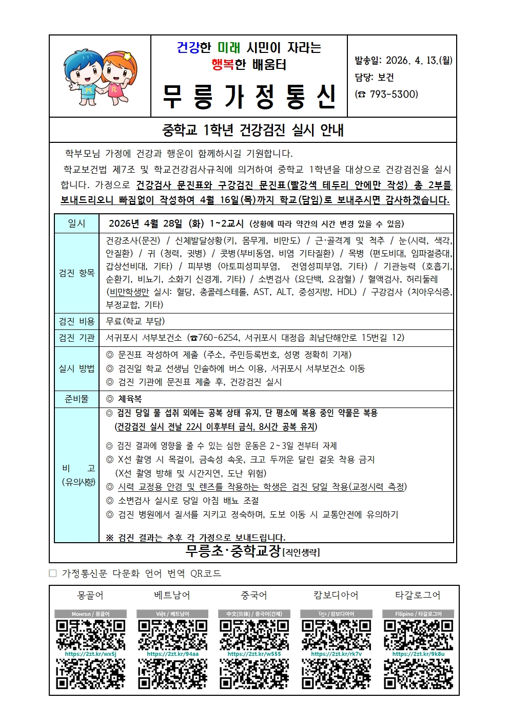 1학년 건강검진 실시 안내