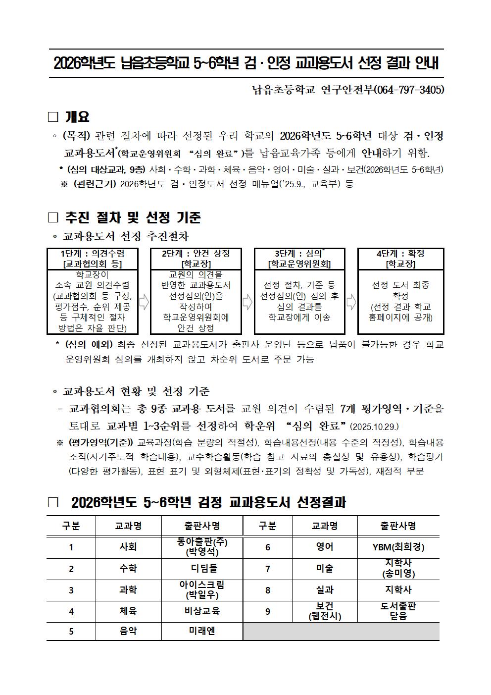 2026학년도 납읍초등학교 5~6학년 검·인정 교과용도서 선정 결과 안내