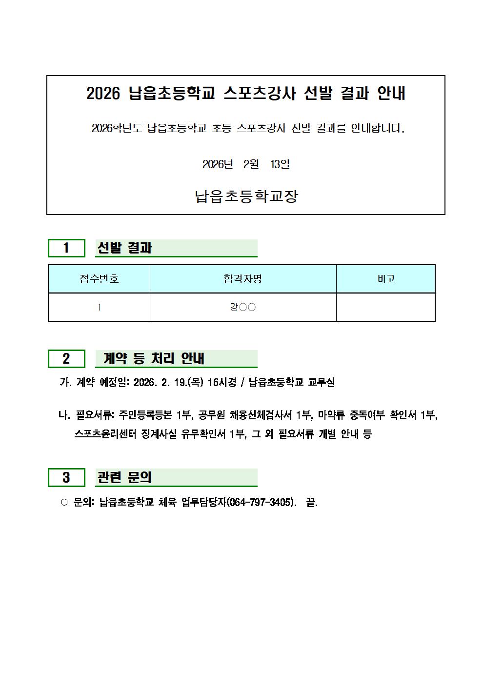 2026 납읍초등학교 스포츠강사 선발 결과 안내