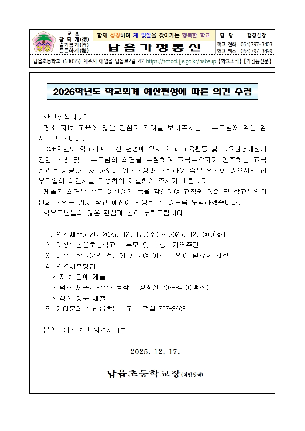 2026학년도 학교회계 예산편성에 따른 의견 수렴