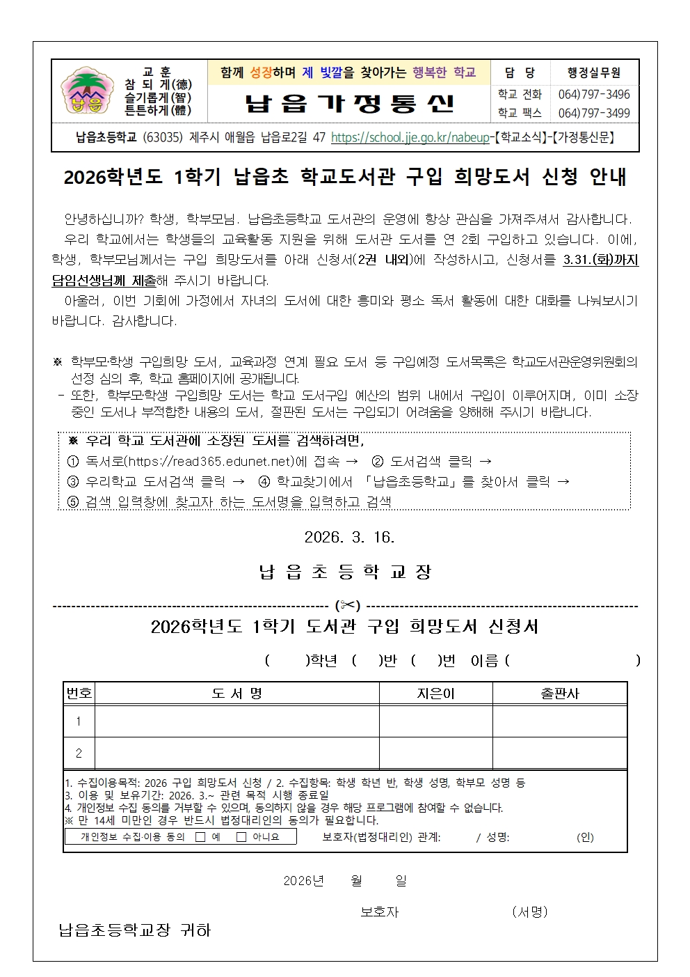2026학년도 1학기 학교도서관 구입 희망도서 신청 안내
