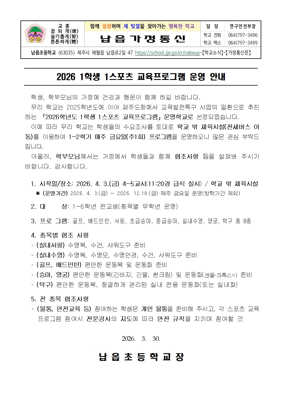 2026학년도 1학생 1스포츠 교육프로그램 운영안내