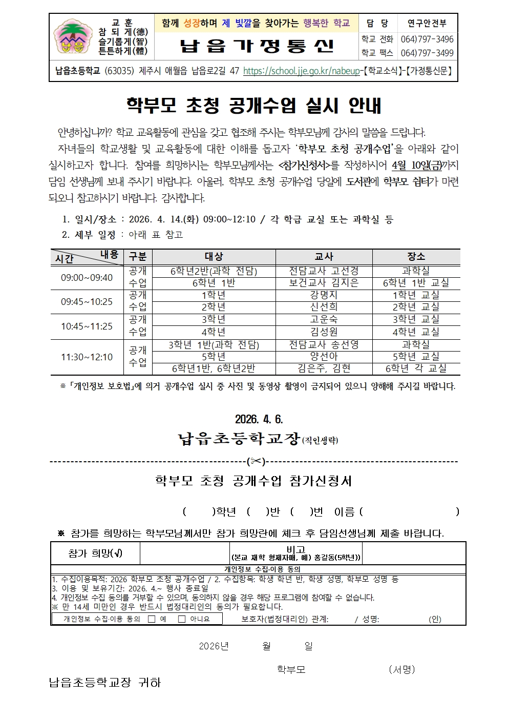 2026학년도 학부모 초청 공개수업 실시 안내