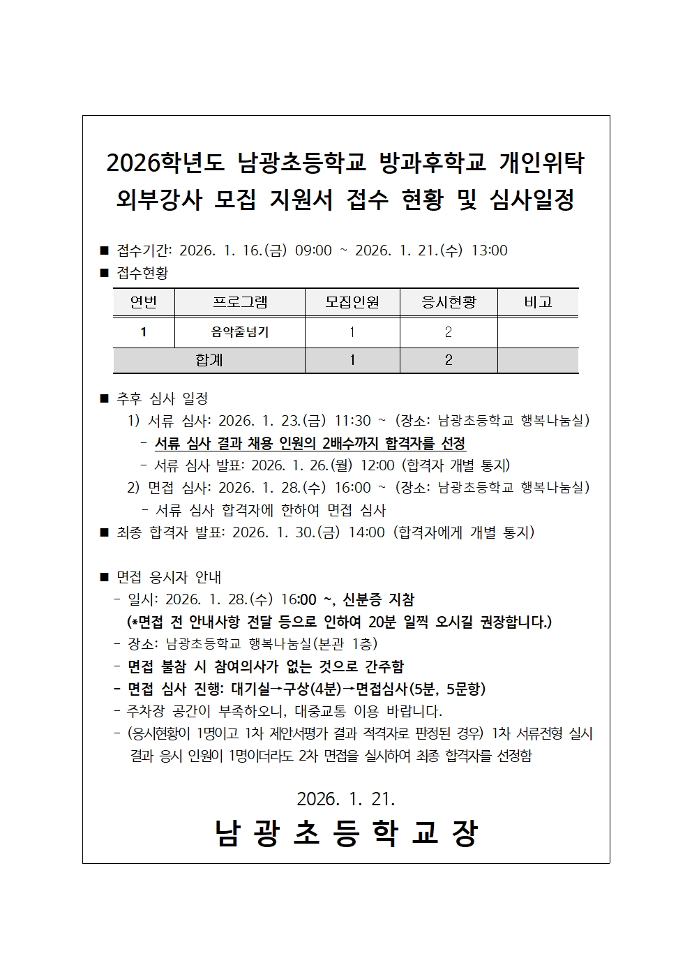 2026학년도 방과후학교 개인위탁 외부강사 모집 지원서 접수 현황 및 심사일정(음악줄넘기)