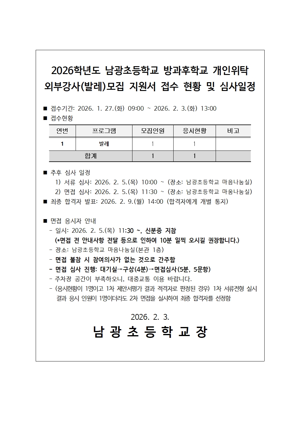2026학년도 방과후학교 개인위탁 외부강사(발레) 모집 지원서 접수 현황 및 심사일정