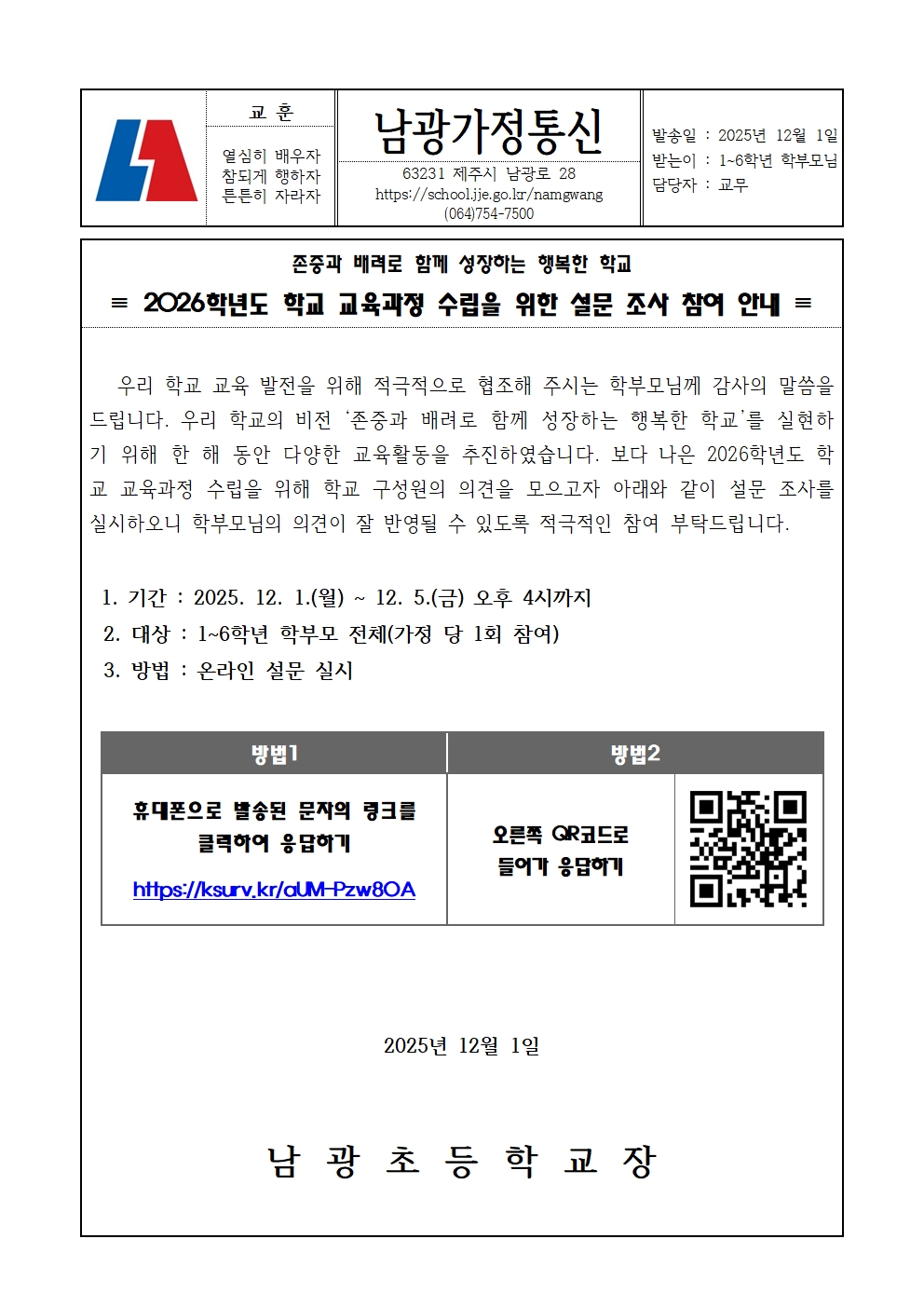 ※ 학교 교육과정 수립을 위한 설문 조사(학부모용) 참여 링크: https://ksurv.kr/aUM-Pzw8OA