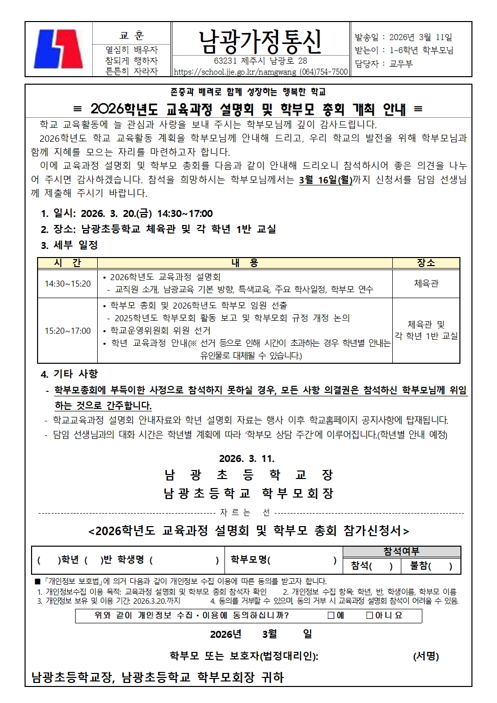 2026 교육과정설명회 및 학부모총회 가정통신문