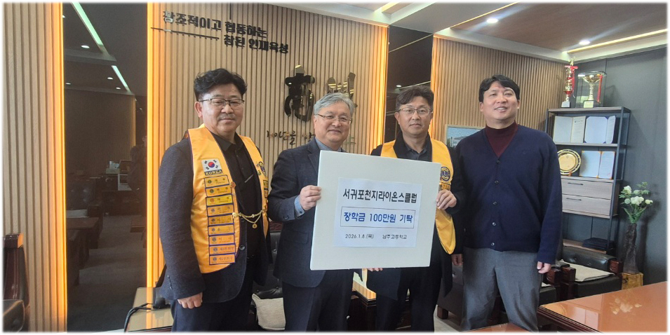 2026년 1월 8일(목) 오후 2시 서귀포천지라이온스클럽 양수웅 회장과 김문형 제1부회장이 남주고등학교 교장실에서 학교발전기금 전달식을 열고 학교발전기금 1백만 원을 기탁했다.