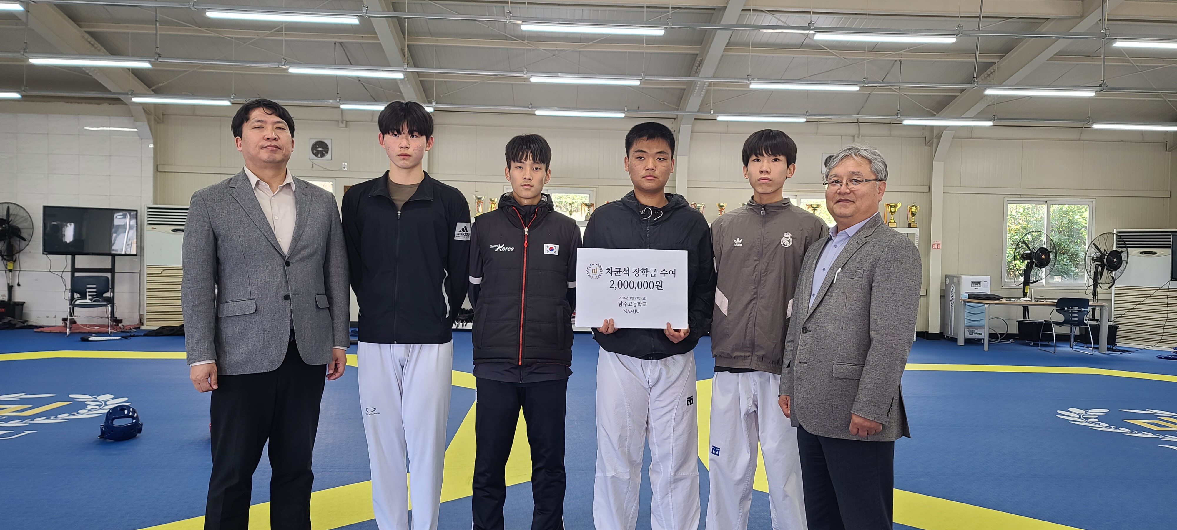 남주고등학교(교장 현순호)는 지난 3월 27일, 본교 회의실에서 천안함 폭침으로 희생된 **고(故) 차균석 중사(남주고 51회)**의 숭고한 희생정신을 기리고 인재를 양성하기 위한 ‘차균석 장학금’ 전달식을 가졌습니다. 이번 장학금은 본교 태권도부의 핵심 주역에게 전달되었습니다.