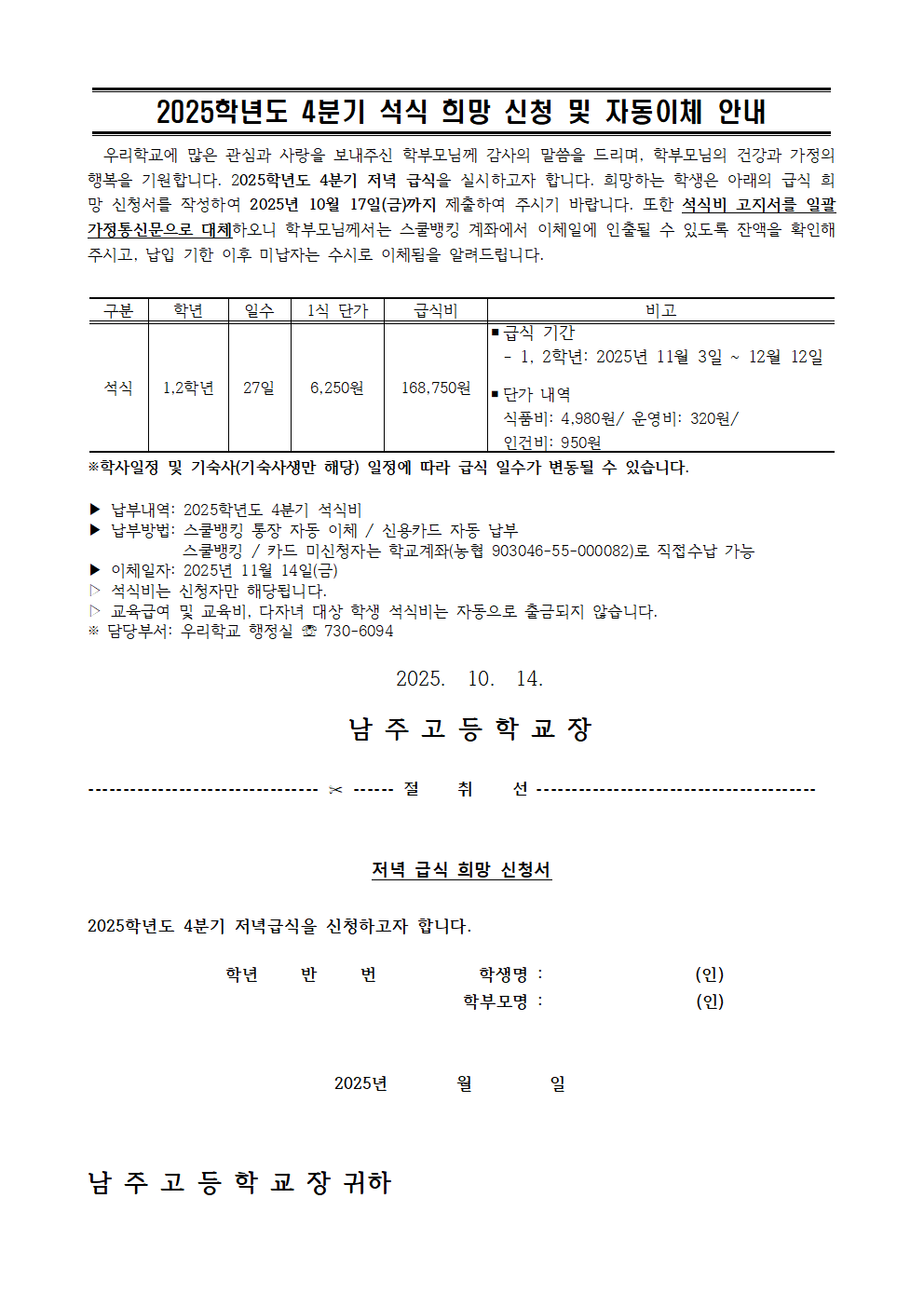 [2025-81호]2025학년도 4분기 석식 희망신청서 및 자동이체 안내문