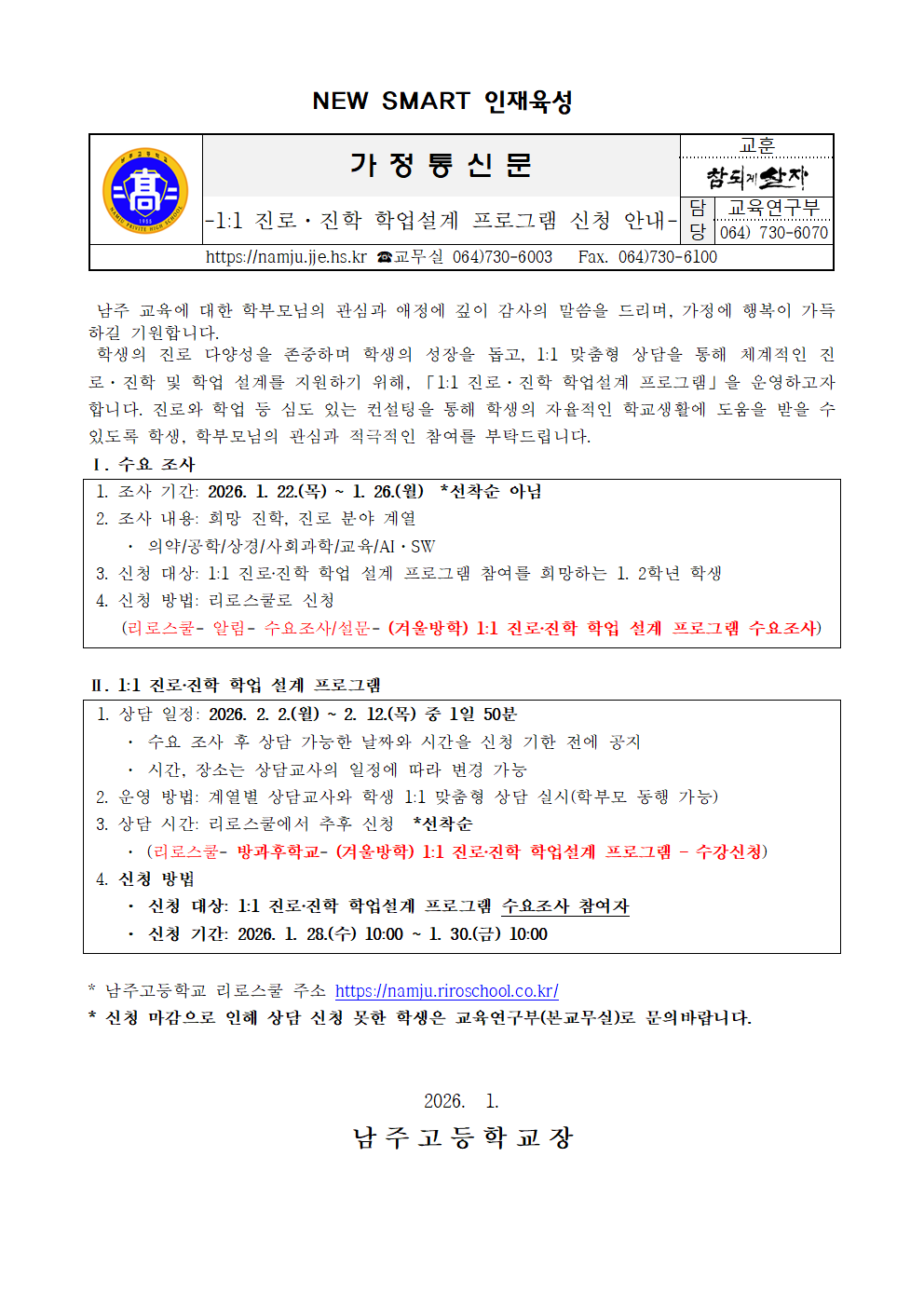 [2026-2호] 2025학년도 겨울방학(2월) 일대일 진로진학 학업설계 프로그램 신청 안내