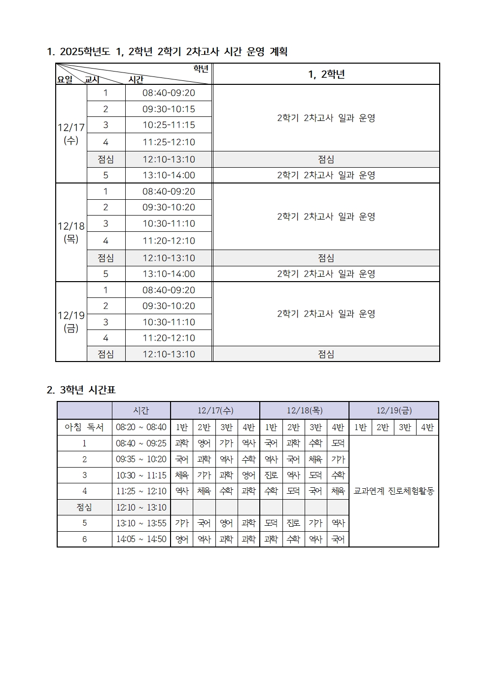 12월17일~12일19일 전학년 일과운영시간안내(1,2학년 2학기 2차고사 운영기간)