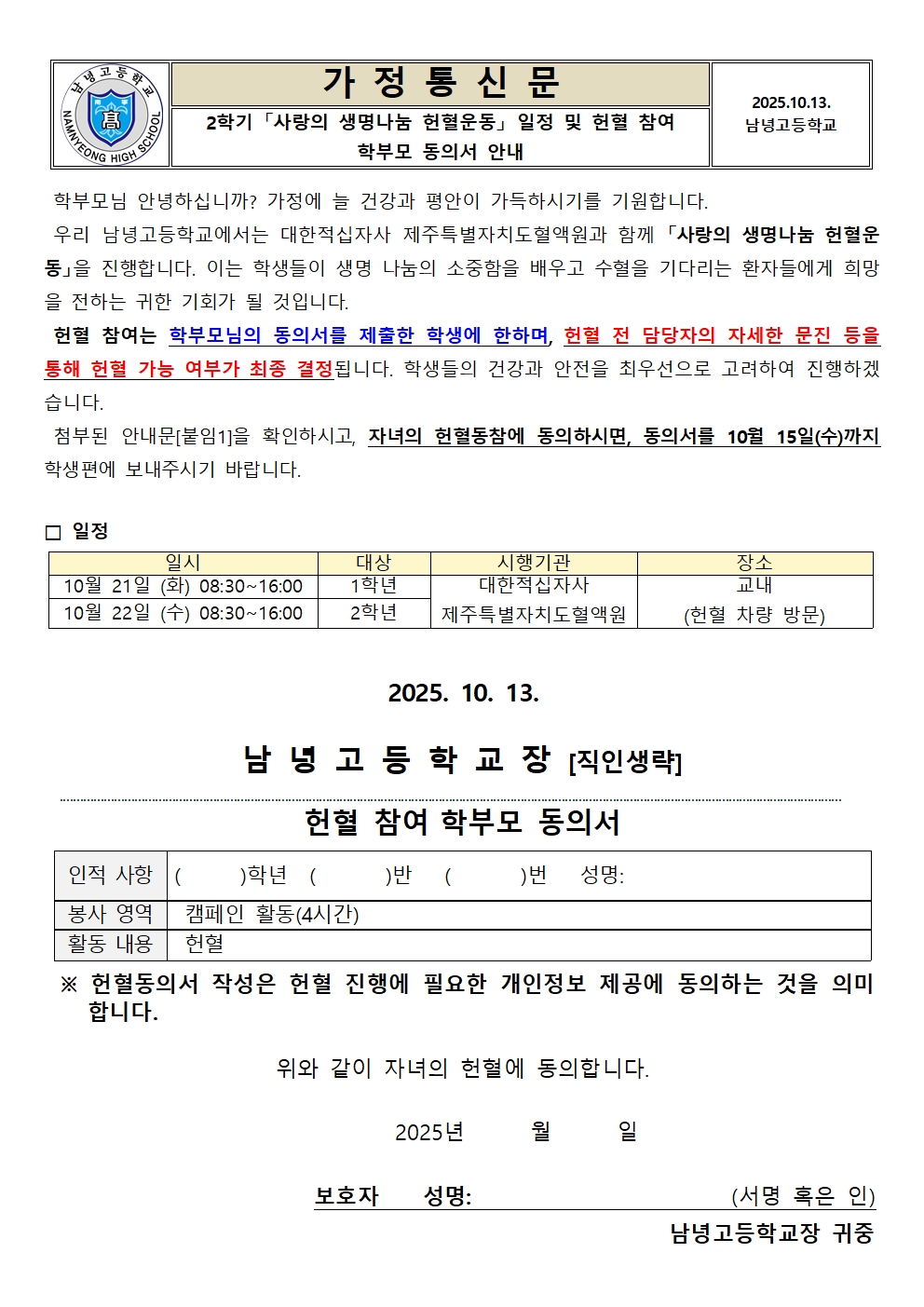 우리 남녕고등학교에서는 대한적십자사 제주특별자치도혈액원과 함께 「사랑의 생명나눔 헌혈운동」을 진행합니다. 이는 학생들이 생명 나눔의 소중함을 배우고 수혈을 기다리는 환자들에게 희망을 전하는 귀한 기회가 될 것입니다.