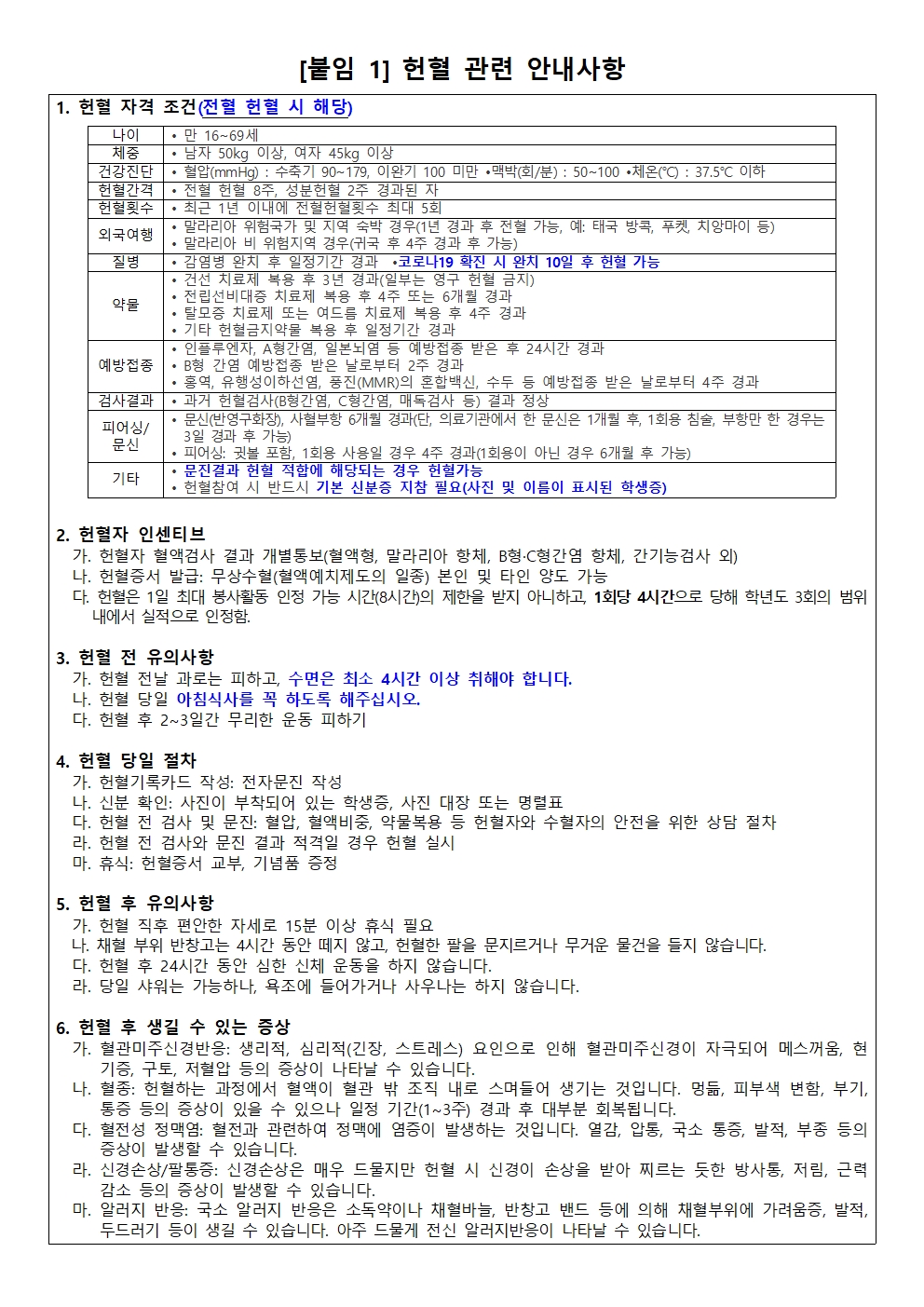 헌혈 참여는 학부모님의 동의서를 제출한 학생에 한하며, 헌혈 전 담당자의 자세한 문진 등을 통해 헌혈 가능 여부가 최종 결정됩니다. 학생들의 건강과 안전을 최우선으로 고려하여 진행하겠습니다.