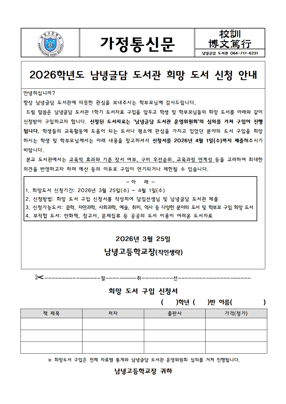 2026학년도 남녕글담 도서관 희망 도서 신청 안내